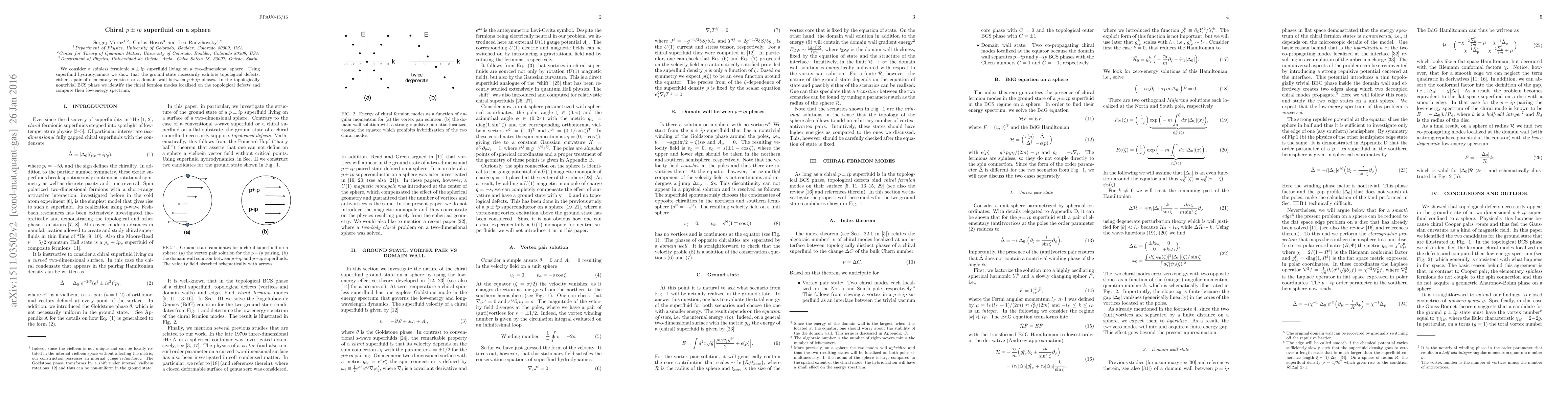 This paper investigates a spinless fermionic $p\pm ip$ superfluid on a sphere, demonstrating that its ground state must contain topological defects, either a pair of vortices or a domain wall. It identifies chiral fermion modes localized on these defects and computes their low-energy spectrum.
