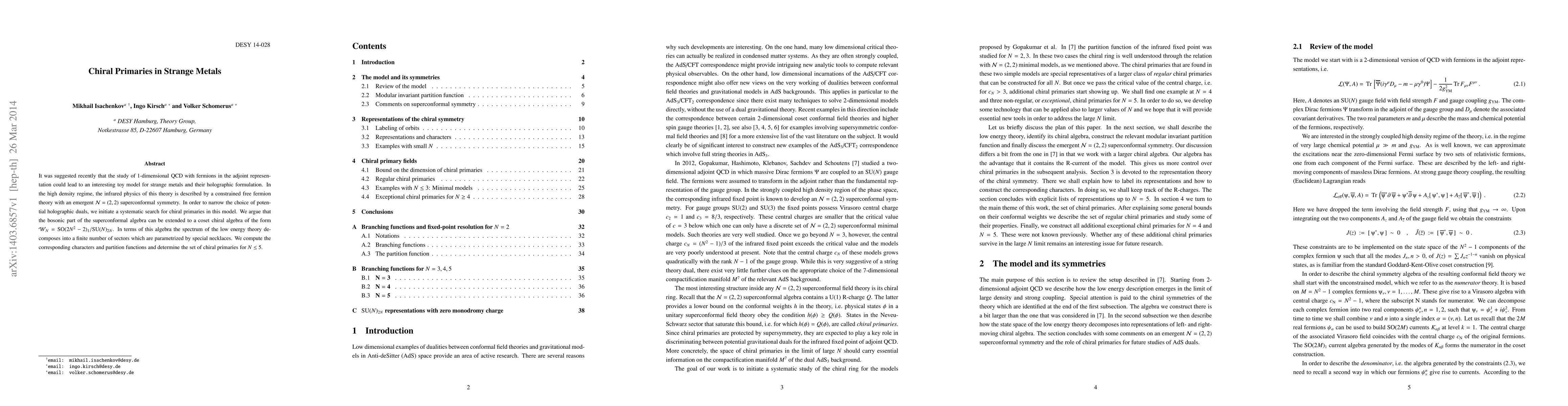 This paper explores a 1-dimensional QCD model with fermions in the adjoint representation as a potential toy model for strange metals, identifying chiral primaries within its constrained free fermion theory. It extends the bosonic part of the superconformal algebra to a coset chiral algebra and determines the set of chiral primaries for N ≤ 5.