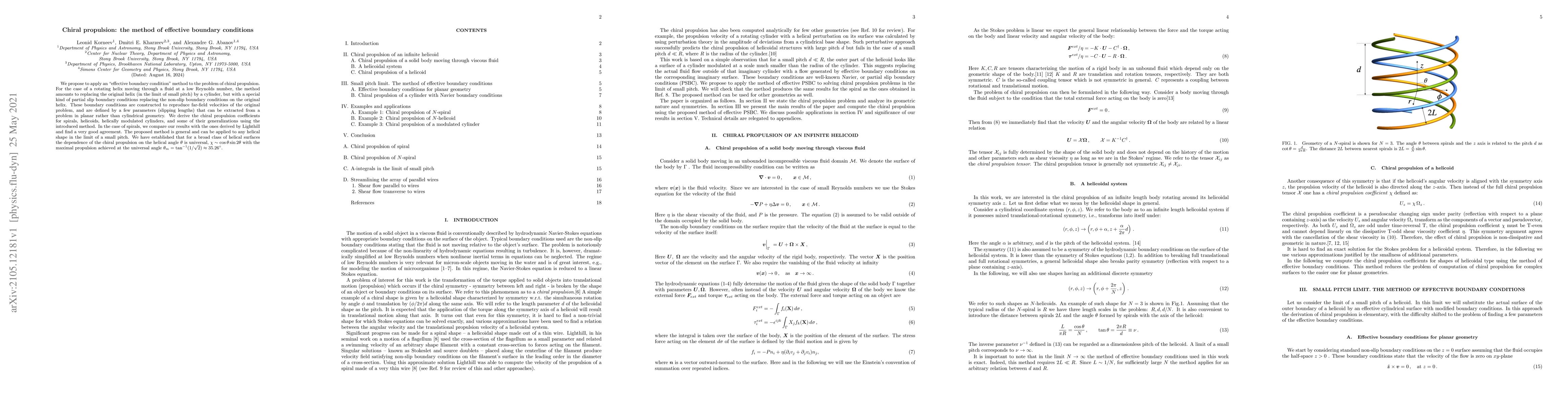 We propose to apply an "effective boundary condition" method to the problem of chiral propulsion. For the case of a rotating helix moving through a fluid at a low Reynolds number, the method amounts to replacing the original helix (in the limit of small pitch) by a cylinder, but with a special kind of partial slip boundary conditions replacing the non-slip boundary conditions on the original helix. These boundary conditions are constructed to reproduce far-field velocities of the original problem, and are defined by a few parameters (slipping lengths) that can be extracted from a problem in planar rather than cylindrical geometry. We derive the chiral propulsion coefficients for spirals, helicoids, helically modulated cylinders, and some of their generalizations using the introduced method. In the case of spirals, we compare our results with the ones derived by Lighthill and find a very good agreement. The proposed method is general and can be applied to any helical shape in the limit of a small pitch. We have established that for a broad class of helical surfaces the dependence of the chiral propulsion on the helical angle $\theta$ is universal, $\chi\sim \cos\theta\sin 2\theta$ with the maximal propulsion achieved at the universal angle $\theta_m = \tan^{-1}(1/\sqrt{2})\approx 35.26^\circ$.