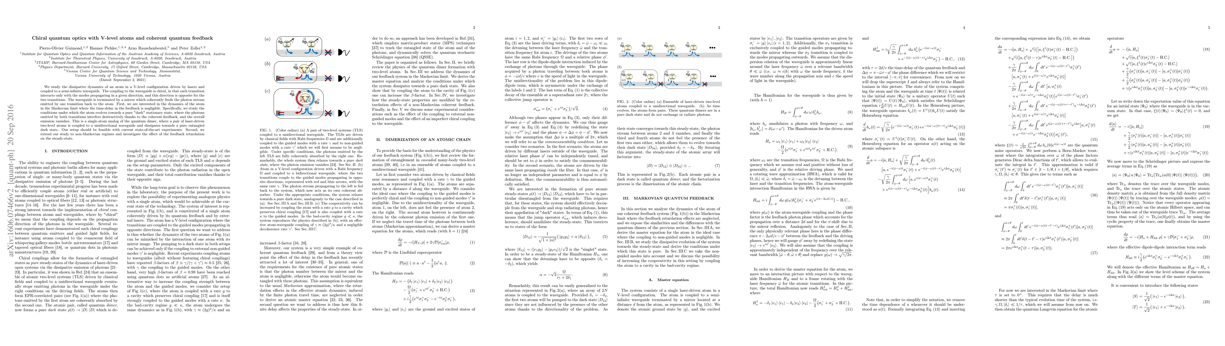 We study the dissipative dynamics of an atom in a V-level configuration driven by lasers and coupled to a semi-infinite waveguide. The coupling to the waveguide is chiral, in that each transition interacts only with the modes propagating in a given direction, and this direction is opposite for the two transitions. The waveguide is terminated by a mirror which coherently feeds the photon stream emitted by one transition back to the atom. First, we are interested in the dynamics of the atom in the Markovian limit where the time-delay in the feedback is negligible. Specifically, we study the conditions under which the atom evolves towards a pure "dark" stationary state, where the photons emitted by both transitions interfere destructively thanks to the coherent feedback, and the overall emission vanishes. This is a single-atom analog of the quantum dimer, where a pair of laser-driven two-level atoms is coupled to a unidirectional waveguide and dissipates towards a pure entangled dark state. Our setup should be feasible with current state-of-the-art experiments. Second, we extend our study to non-Markovian regimes and investigate the effect of the feedback retardation on the steady-state.