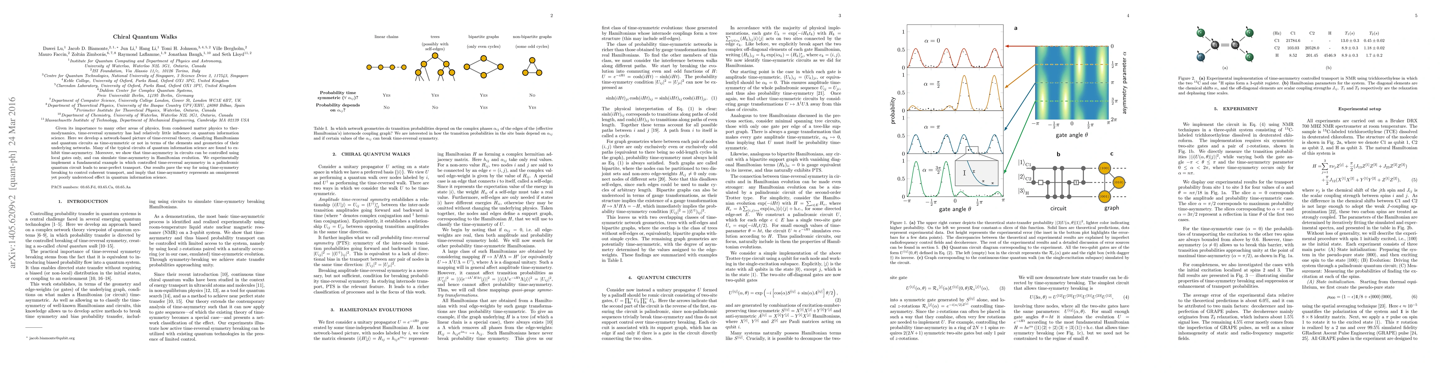 Given its importance to many other areas of physics, from condensed matter physics to thermodynamics, time-reversal symmetry has had relatively little influence on quantum information science. Here we develop a network-based picture of time-reversal theory, classifying Hamiltonians and quantum circuits as time-symmetric or not in terms of the elements and geometries of their underlying networks. Many of the typical circuits of quantum information science are found to exhibit time-asymmetry. Moreover, we show that time-asymmetry in circuits can be controlled using local gates only, and can simulate time-asymmetry in Hamiltonian evolution. We experimentally implement a fundamental example in which controlled time-reversal asymmetry in a palindromic quantum circuit leads to near-perfect transport. Our results pave the way for using time-symmetry breaking to control coherent transport, and imply that time-asymmetry represents an omnipresent yet poorly understood effect in quantum information science.
