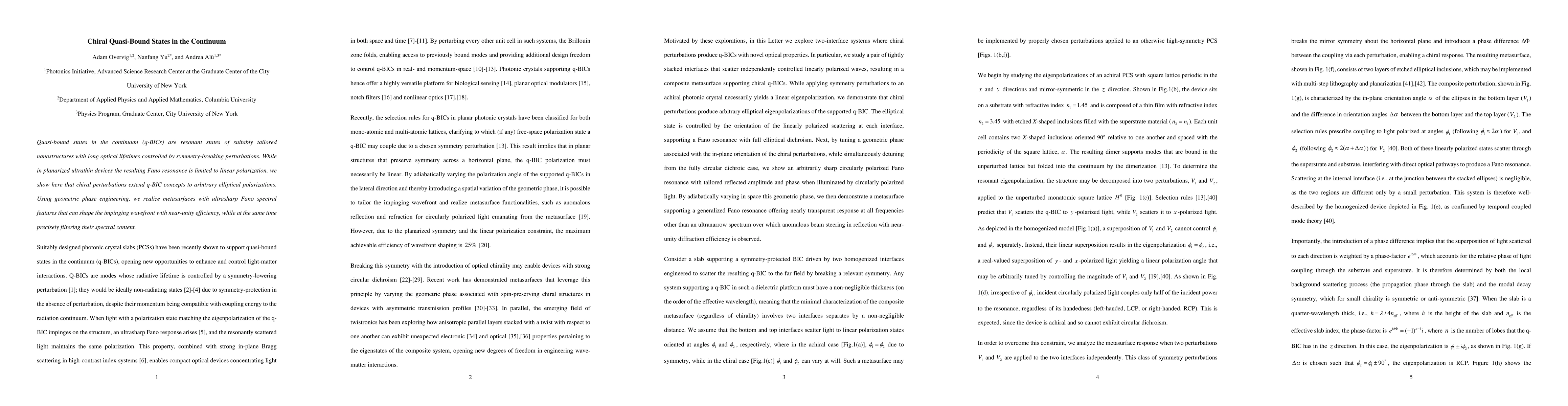 This paper demonstrates the extension of quasi-bound states in the continuum (q-BICs) to chiral perturbations, enabling resonant states in nanostructures with long optical lifetimes for arbitrary elliptical polarizations. The authors achieve ultrasharp Fano resonances and near-unity efficiency in metasurfaces through geometric phase engineering.