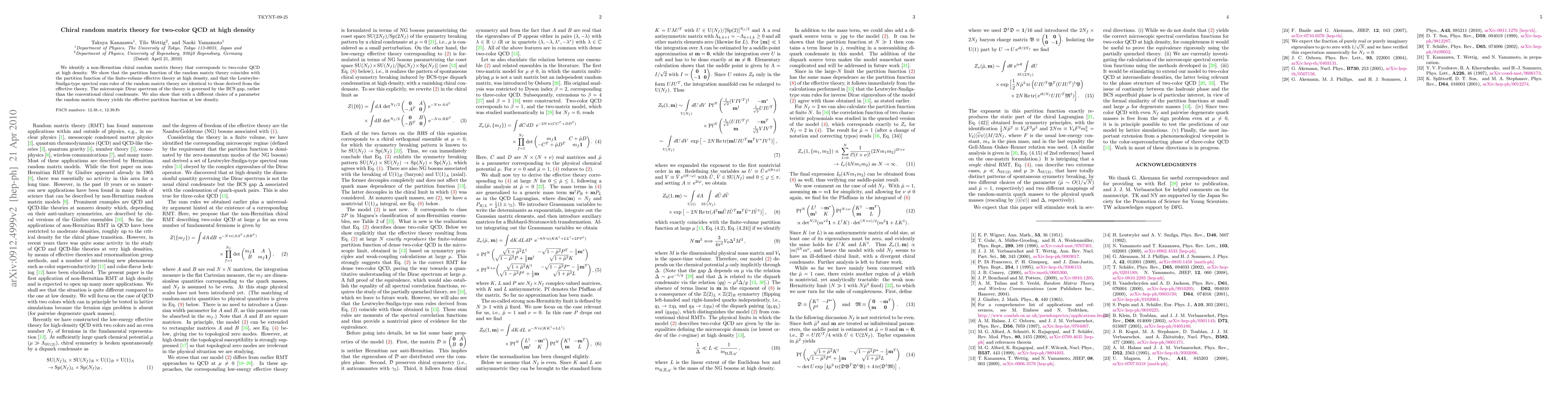 The paper proposes a non-Hermitian chiral random matrix theory equivalent to two-color QCD at high density, showing matching partition functions and spectral sum rules. The Dirac spectrum is dictated by the BCS gap instead of the chiral condensate, and the theory also describes low-density behavior with a parameter adjustment.