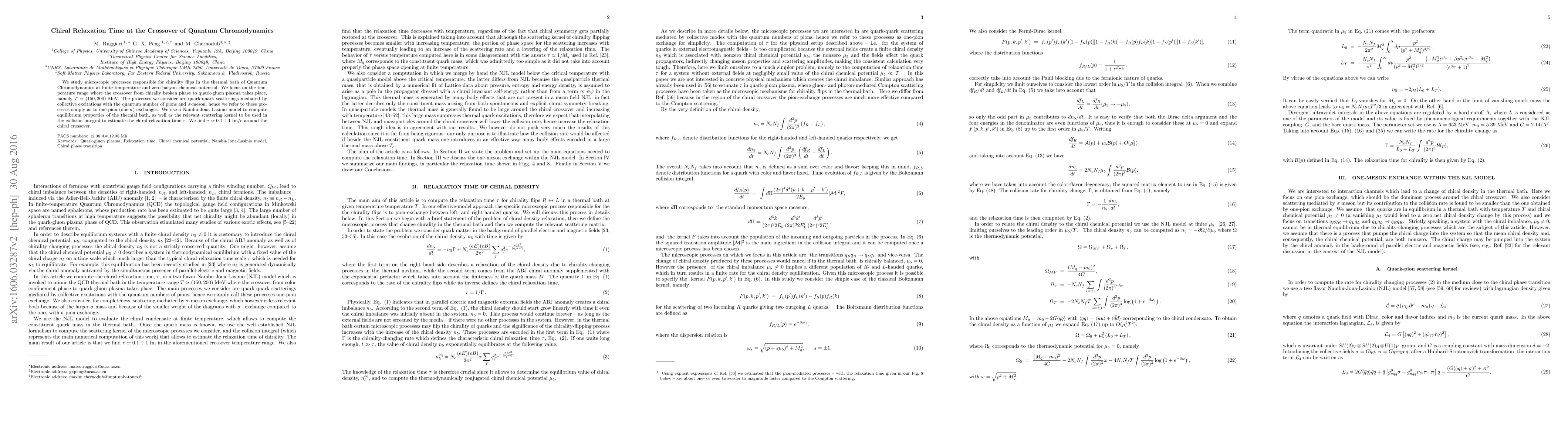 We study microscopic processes responsible for chirality flips in the thermal bath of Quantum Chromodynamics at finite temperature and zero baryon chemical potential. We focus on the temperature range where the crossover from chirally broken phase to quark-gluon plasma takes place, namely $T \simeq (150, 200)$ MeV. The processes we consider are quark-quark scatterings mediated by collective excitations with the quantum number of pions and $\sigma$-meson, hence we refer to these processes simply as \sugg{to} one-pion (one-$\sigma$) exchange\sugg{s}. We use a Nambu-Jona-Lasinio model to compute equilibrium properties of the thermal bath, as well as the relevant scattering kernel to be used in the collision integral to estimate the chiral relaxation time $\tau$. We find $\tau\simeq 0.1 \div 1$ fm/c around the chiral crossover.