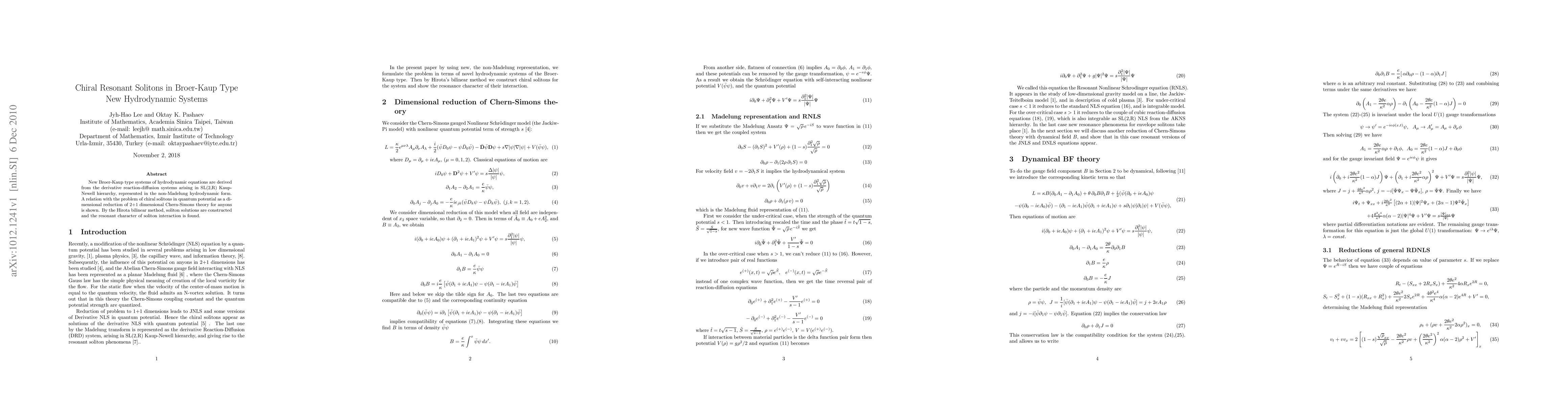 New Broer-Kaup type systems of hydrodynamic equations are derived from the derivative reaction-diffusion systems arising in SL(2,R) Kaup-Newell hierarchy, represented in the non-Madelung hydrodynamic form. A relation with the problem of chiral solitons in quantum potential as a dimensional reduction of 2+1 dimensional Chern-Simons theory for anyons is shown. By the Hirota bilinear method, soliton solutions are constructed and the resonant character of soliton interaction is found.