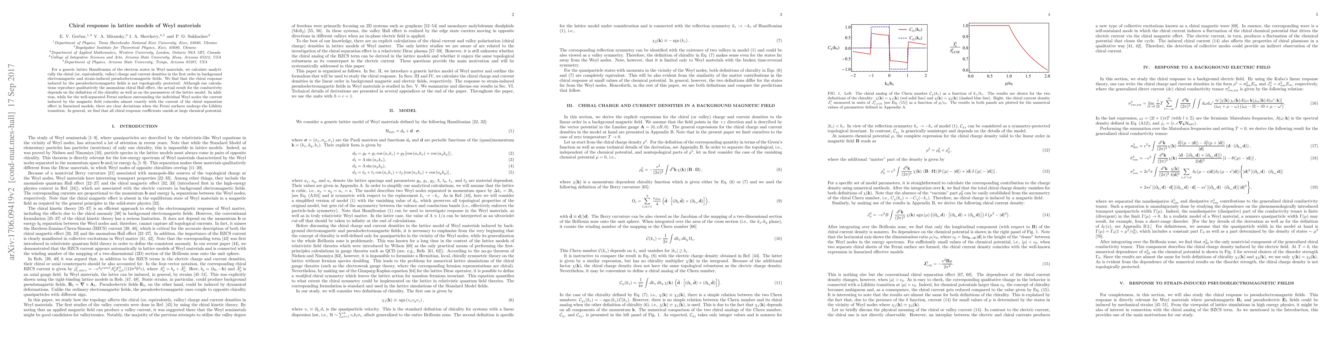 For a generic lattice Hamiltonian of the electron states in Weyl materials, we calculate analytically the chiral (or, equivalently, valley) charge and current densities in the first order in background electromagnetic and strain-induced pseudoelectromagnetic fields. We find that the chiral response induced by the pseudoelectromagnetic fields is not topologically protected. Although our calculations reproduce qualitatively the anomalous chiral Hall effect, the actual result for the conductivity depends on the definition of the chirality as well as on the parameters of the lattice model. In addition, while for the well- separated Fermi surfaces surrounding the individual Weyl nodes the current induced by the magnetic field coincides almost exactly with the current of the chiral separation effect in linearized models, there are clear deviations when the Fermi surfaces undergo the Lifshitz transition. In general, we find that all chiral response coefficients vanish at large chemical potential.