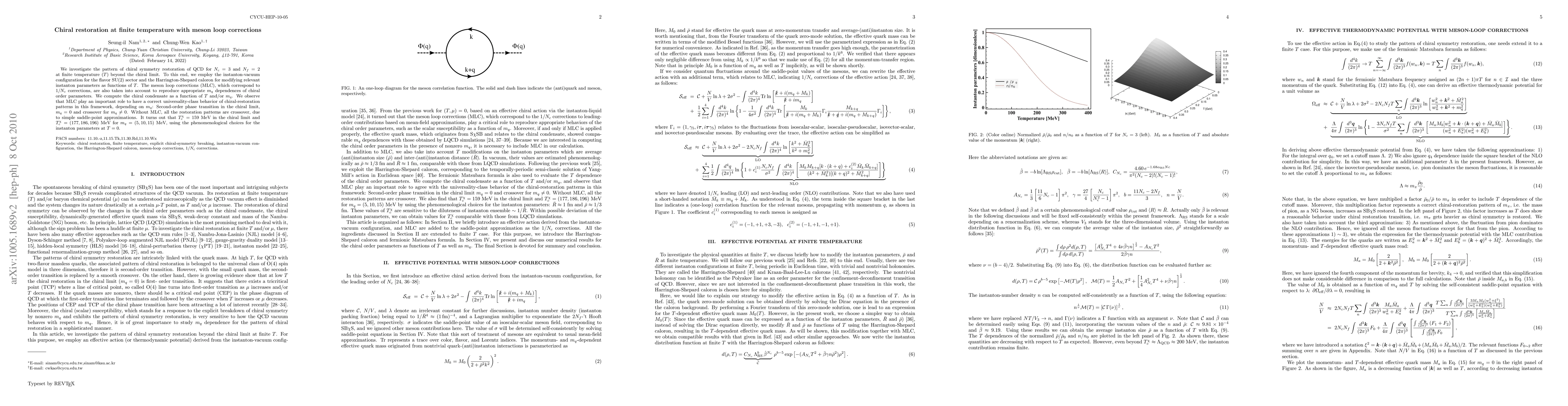 We investigate chiral-restoration patterns of QCD for N_{c}=3 and N_{f}=2 at finite temperature (T) and zero quark-chemical potential beyond the chiral limit, indicating the explicit chiral-symmetry breaking. To this end, we employ the instanton-vacuum configuration for the flavor SU(2) sector and the Harrington-Shepard caloron for modifying relevant instanton parameters as functions of T. The meson-loop corrections (MLC), which correspond to 1/N_{c} corrections, are also taken into account to reproduce appropriate m_{q} dependences of chiral order parameters. We compute chiral condensate as a function of T and/or m_{q}. From the numerical calculations, we observe that MLC play an important role to have a correct universality-class behavior of chiral-restoration patterns in this framework, depending on m_{q}: Second-order phase transition in the chiral limit, m_{q}=0 and crossover for m_{q}>0. Without MLC, all the restoration patterns are crossover, due to simple saddle-point approximations. It turns out that T^{\chi}_{c}=159 MeV in the chiral limit and T^{\chi}_{c}=(177,186,196) MeV for m_{q}=(5,10,15) MeV, using the phenomenological choices for the instanton parameters at T=0.