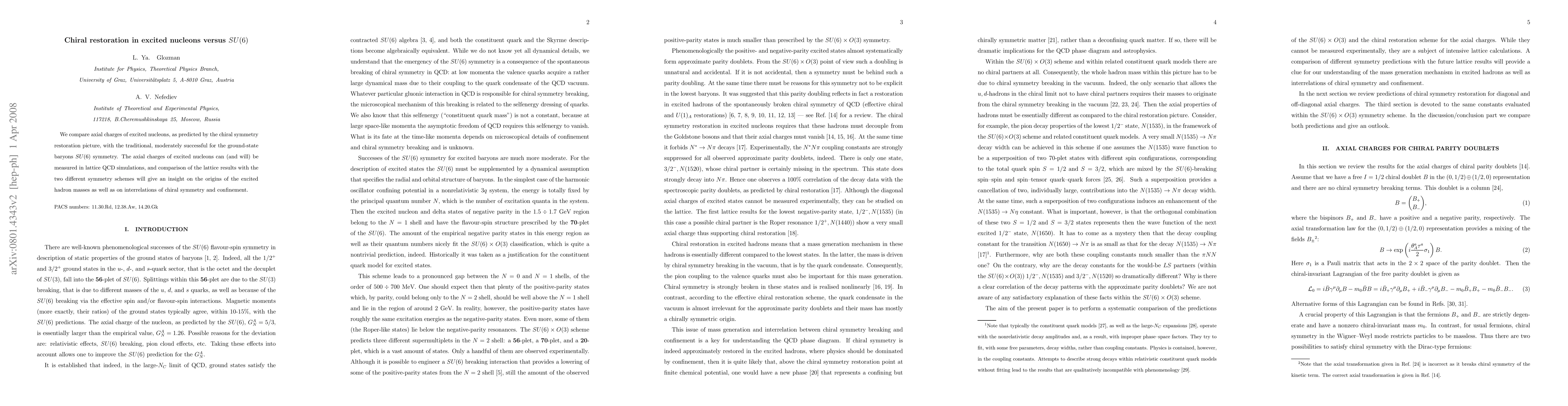 We compare axial charges of excited nucleons, as predicted by the chiral symmetry restoration picture, with the traditional, moderately successful for the ground-state baryons SU(6) symmetry. The axial charges of excited nucleons can (and will) be measured in lattice QCD simulations, and comparison of the lattice results with the two different symmetry schemes will give an insight on the origins of the excited hadron masses as well as on interrelations of chiral symmetry and confinement.