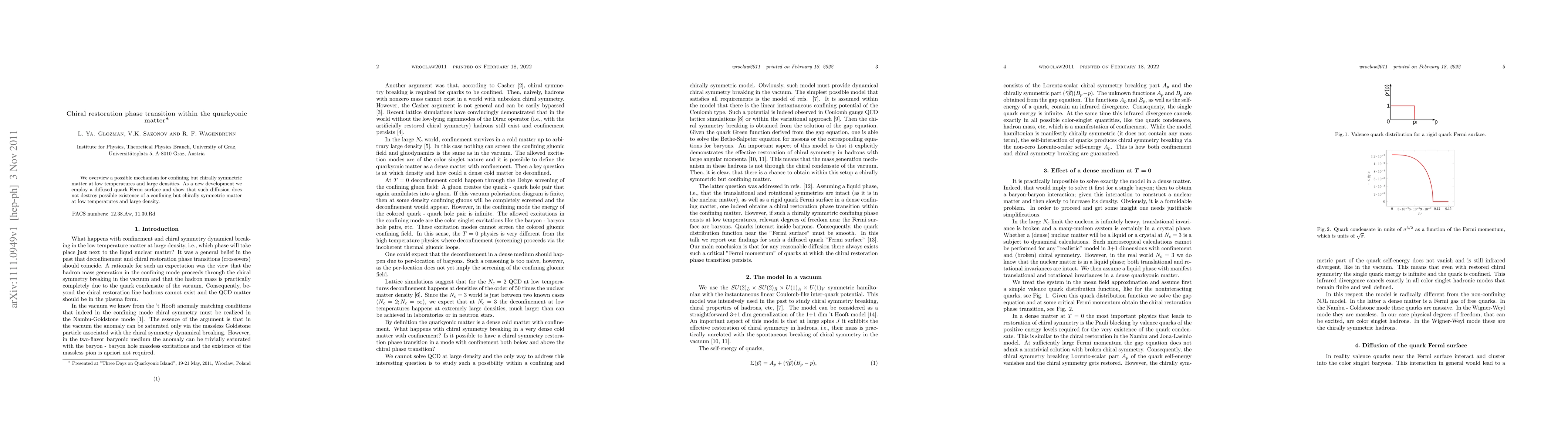 We overview a possible mechanism for confining but chirally symmetric matter at low temperatures and large densities. As a new development we employ a diffused quark Fermi surface and show that such diffusion does not destroy possible existence of a confining but chirally symmetric matter at low temperatures and large density.