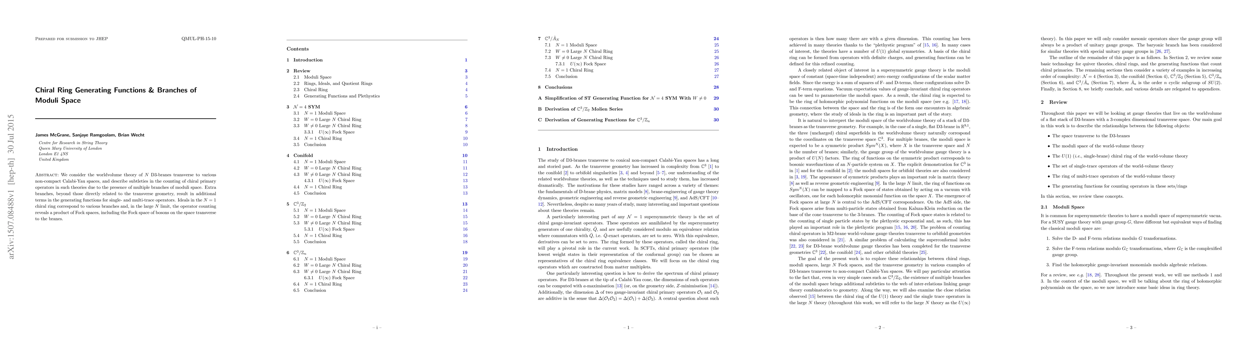 We consider the worldvolume theory of N D3-branes transverse to various non-compact Calabi-Yau spaces, and describe subtleties in the counting of chiral primary operators in such theories due to the presence of multiple branches of moduli space. Extra branches, beyond those directly related to the transverse geometry, result in additional terms in the generating functions for single- and multi-trace operators. Ideals in the N=1 chiral ring correspond to various branches and, in the large N limit, the operator counting reveals a product of Fock spaces, including the Fock space of bosons on the space transverse to the branes.