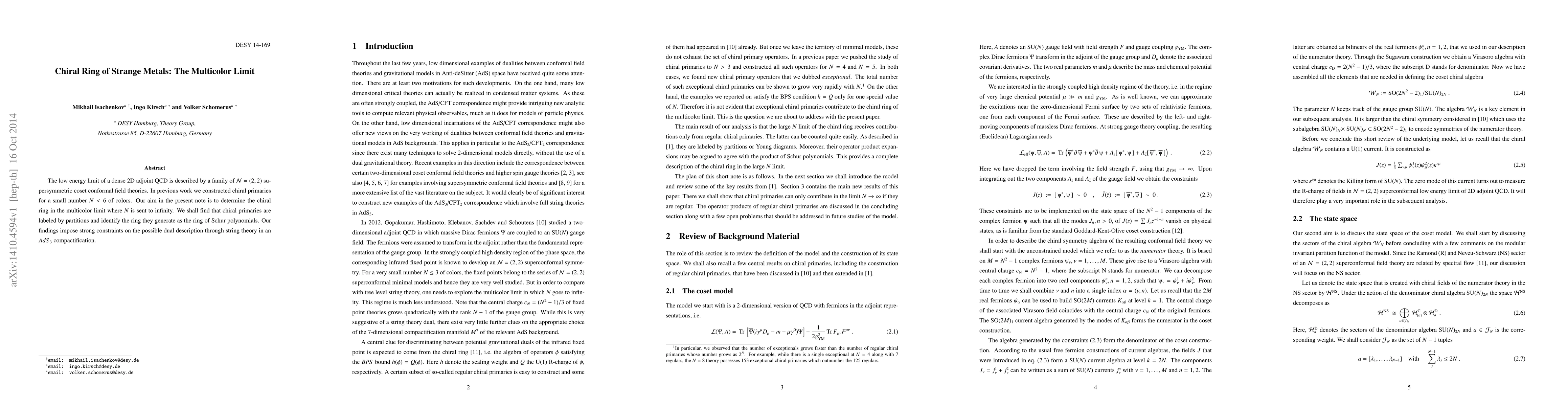 This paper investigates the chiral ring of strange metals in the multicolor limit of dense 2D adjoint QCD, finding that chiral primaries correspond to partitions and generate the ring of Schur polynomials. These results provide significant constraints on dual descriptions via string theory in $AdS_3$ compactifications.