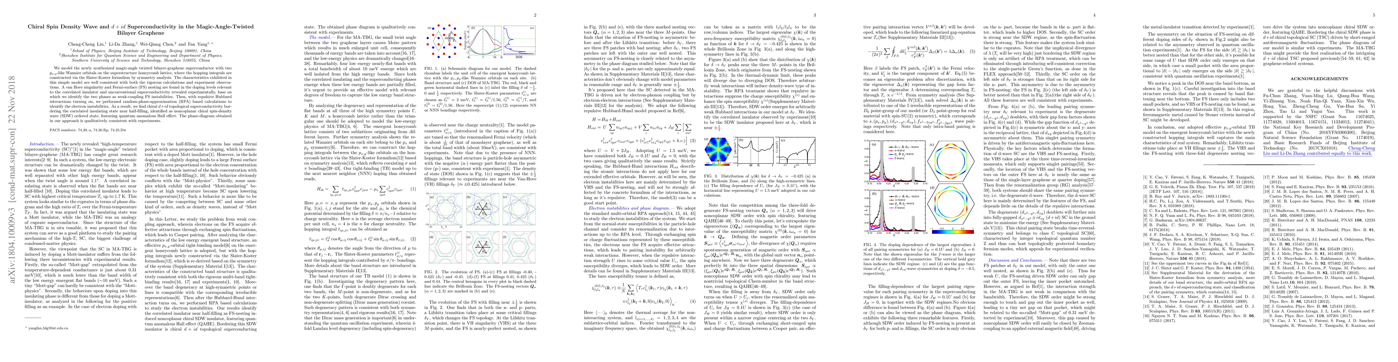This study models magic-angle twisted bilayer-graphene superconductor to find chiral d+id topological superconductivity and noncoplanar spin-density wave ordered state, with results consistent with experiments.