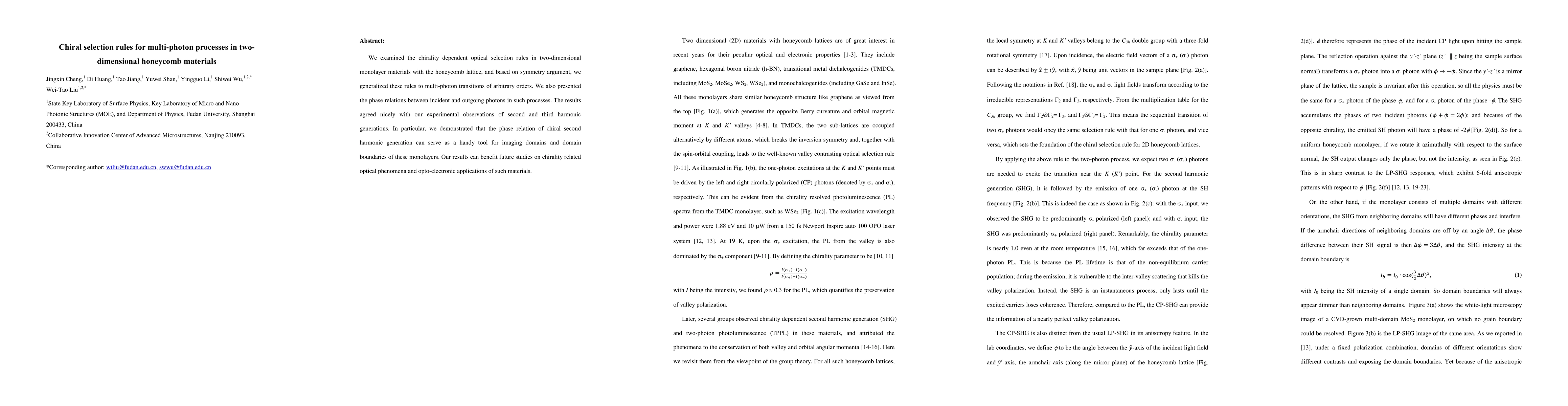 We examined the chirality dependent optical selection rules in two-dimensional monolayer materials with the honeycomb lattice, and based on symmetry argument, we generalized these rules to multi-photon transitions of arbitrary orders. We also presented the phase relations between incident and outgoing photons in such processes. The results agreed nicely with our experimental observations of second and third harmonic generations. In particular, we demonstrated that the phase relation of chiral second harmonic generation can serve as a handy tool for imaging domains and domain boundaries of these monolayers. Our results can benefit future studies on chirality related optical phenomena and opto-electronic applications of such materials.