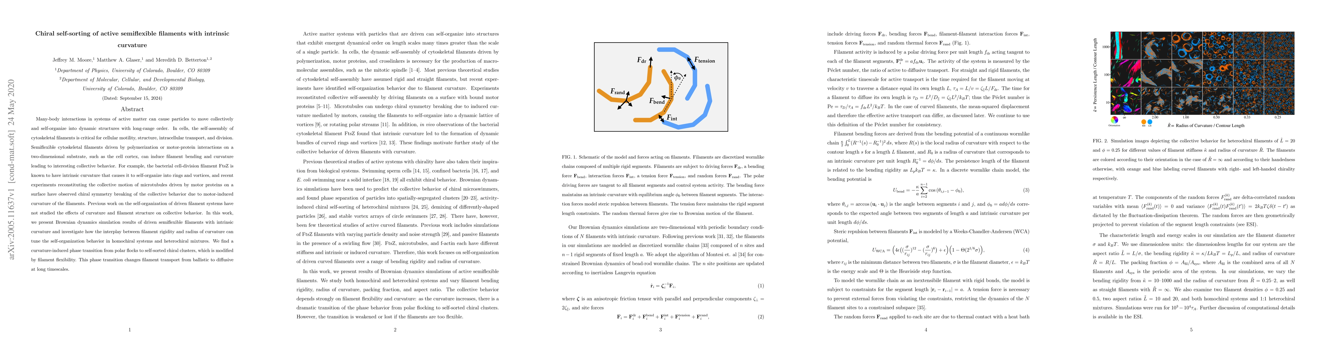 This paper investigates the chiral self-sorting of active semiflexible filaments with intrinsic curvature through Brownian dynamics simulations. It finds that filament rigidity and curvature induce a phase transition from polar flocks to chiral clusters, altering transport from ballistic to diffusive over time.