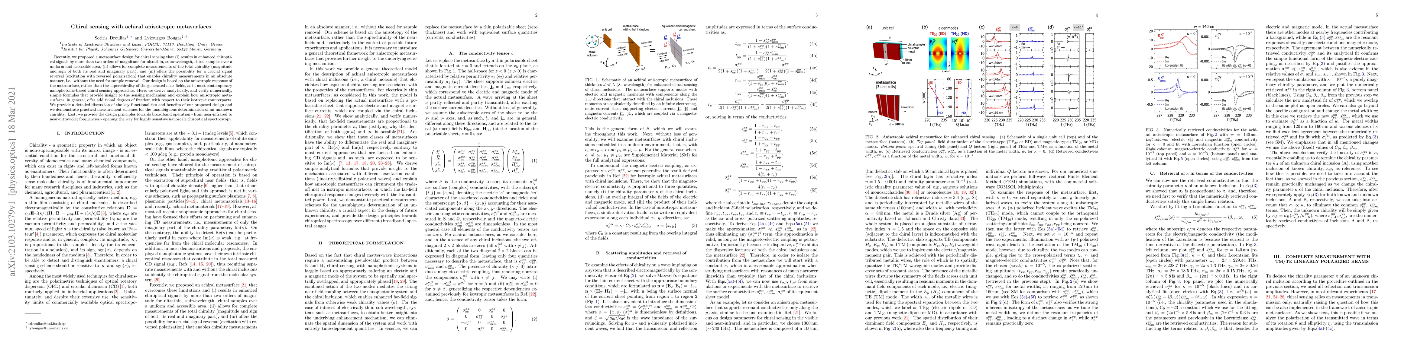 Recently, we proposed a metasurface design for chiral sensing that (i) results in enhanced chiroptical signals by more than two orders of magnitude for ultrathin, subwavelength, chiral samples over a uniform and accessible area, (ii) allows for complete measurements of the total chirality (magnitude and sign of both its real and imaginary part), and (iii) offers the possibility for a crucial signal reversal (excitation with reversed polarization) that enables chirality measurements in an absolute manner, i.e., without the need for sample removal. Our design is based on the anisotropic response of the metasurface, rather than the superchirality of the generated near-fields, as in most contemporary nanophotonic-based chiral sensing approaches. Here, we derive analytically, and verify numerically, simple formulas that provide insight to the sensing mechanism and explain how anisotropic metasurfaces, in general, offer additional degrees of freedom with respect to their isotropic counterparts. We provide a detailed discussion of the key functionalities and benefits of our proposed design and we demonstrate practical measurement schemes for the unambiguous determination of an unknown chirality. Last, we provide the design principles towards broadband operation - from near-infrared to near-ultraviolet frequencies - opening the way for highly sensitive nanoscale chiroptical spectroscopy.