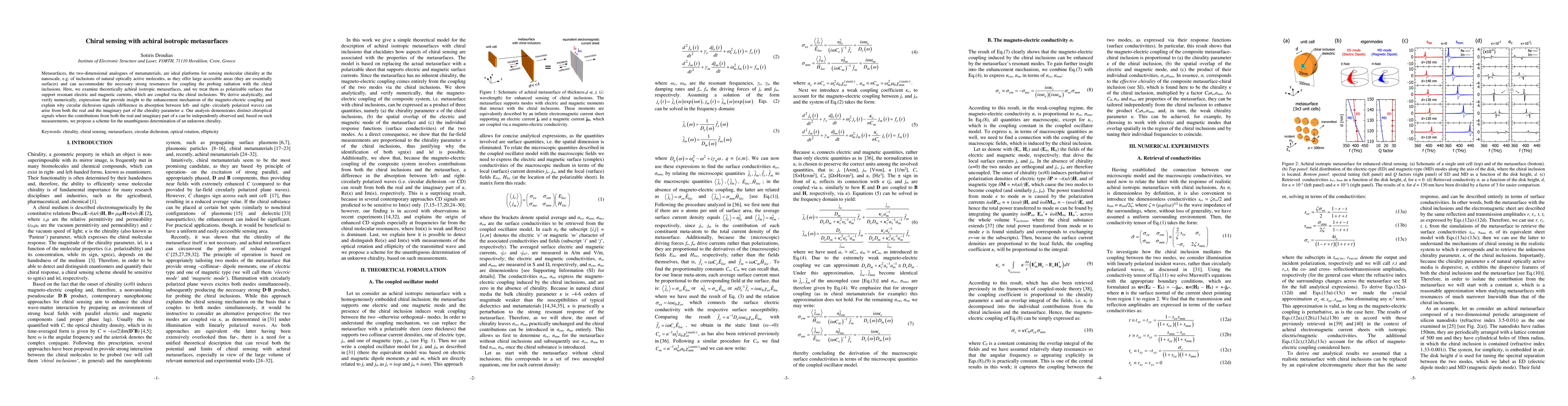 Metasurfaces, the two-dimensional analogues of metamaterials, are ideal platforms for sensing molecular chirality at the nanoscale, e.g. of inclusions of natural optically active molecules, as they offer large accessible areas (they are essentially surfaces) and can accommodate the necessary strong resonances for coupling the probing radiation with the chiral inclusions. Here, we examine theoretically achiral isotropic metasurfaces, and we treat them as polarizable surfaces that support resonant electric and magnetic currents, which are coupled via the chiral inclusions. We derive analytically, and verify numerically, expressions that provide insight to the enhancement mechanism of the magneto-electric coupling and explain why circular dichroism signals (difference in absorption between left- and right- circularly polarized waves) can arise from both the real and the imaginary part of the chirality parameter $\kappa$. Our analysis demonstrates distinct chiroptical signals where the contributions from both the real and imaginary part of $\kappa$ can be independently observed and, based on such measurements, we propose a scheme for the unambiguous determination of an unknown chirality.