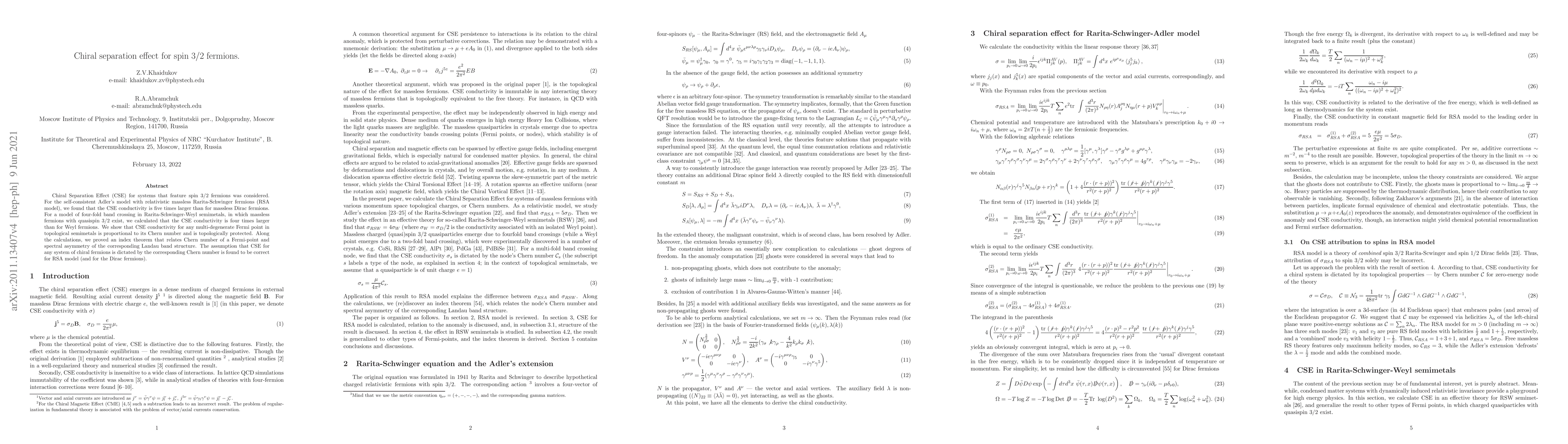 Chiral Separation Effect (CSE) for systems that feature spin 3/2 fermions was considered. For the self-consistent Adler's model with relativistic massless Rarita-Schwinger fermions (RSA model), we found that the CSE conductivity is five times larger than for massless Dirac fermions. For a model of four-fold band crossing in Rarita-Schwinger-Weyl semimetals, in which massless fermions with quasispin 3/2 exist, we calculated that the CSE conductivity is four times larger than for Weyl fermions. We show that CSE conductivity for any multi-degenerate Fermi point in topological semimetals is proportional to its Chern number and is topologically protected. Along the calculations, we proved an index theorem that relates Chern number of a Fermi-point and spectral asymmetry of the corresponding Landau band structure. The assumption that CSE for any system of chiral fermions is dictated by the corresponding Chern number is found to be correct for RSA model (and for the Dirac fermions).
