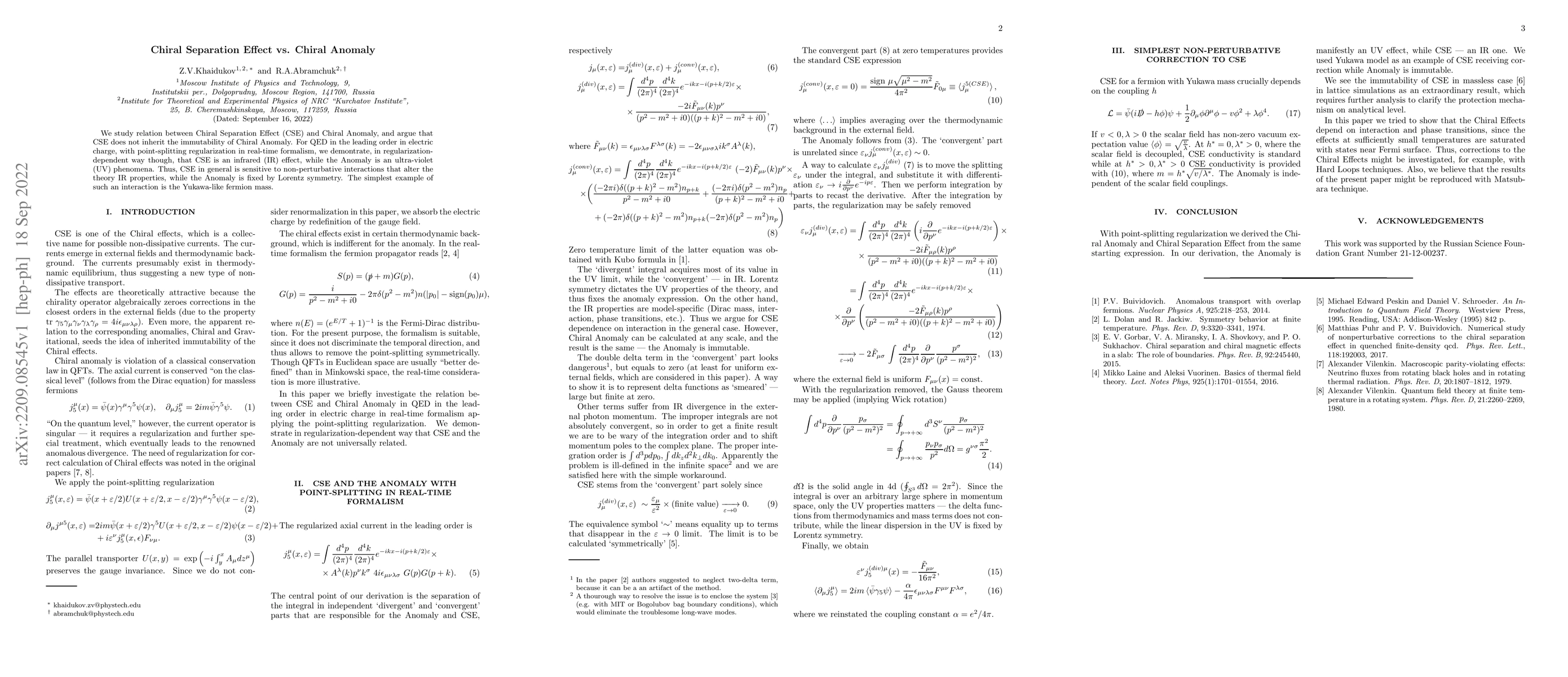 We study relation between Chiral Separation Effect (CSE) and Chiral Anomaly, and argue that CSE does not inherit the immutability of Chiral Anomaly. For QED in the leading order in electric charge, with point-splitting regularization in real-time formalism, we demontrate, in regularization-dependent way though, that CSE is an infrared (IR) effect, while the Anomaly is an ultra-violet (UV) phenomena. Thus, CSE in general is sensitive to non-perturbative interactions that alter the theory IR properties, while the Anomaly is fixed by Lorentz symmetry. The simplest example of such an interaction is the Yukawa-like fermion mass.