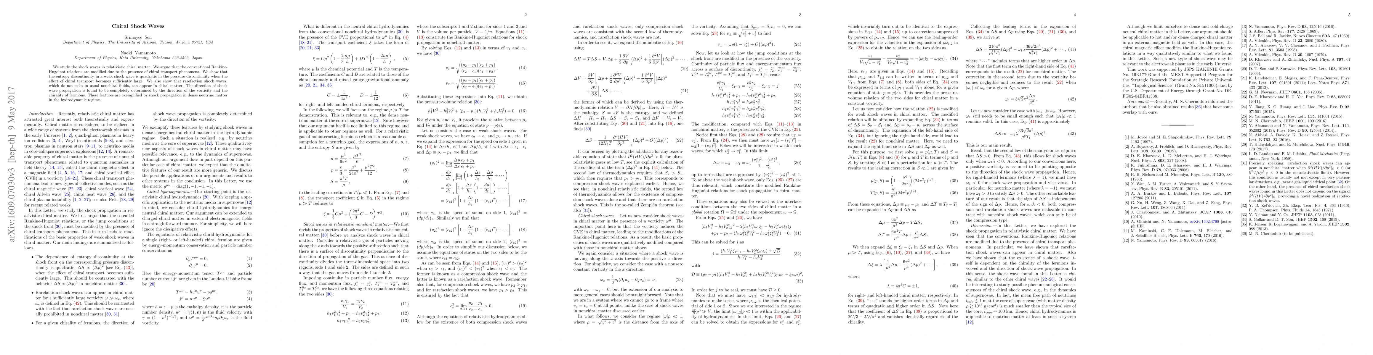 We study the shock waves in relativistic chiral matter. We argue that the conventional Rankine-Hugoinot relations are modified due to the presence of chiral transport phenomena. We show that the entropy discontinuity in a weak shock wave is quadratic in the pressure discontinuity when the effect of chiral transport becomes sufficiently large. We also show that rarefaction shock waves, which do not exist in usual nonchiral fluids, can appear in chiral matter. The direction of shock wave propagation in a vorticity is found to be completely determined by the direction of the vorticity and the chirality of fermions. These features are exemplified by shock propagation in dense neutrino matter in the hydrodynamic regime.