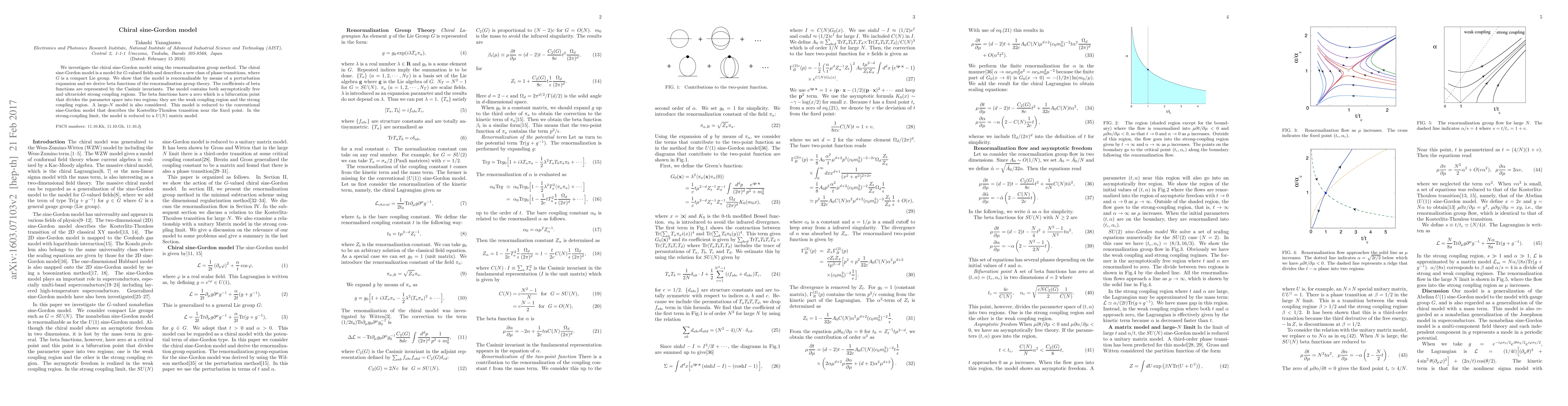 We investigate the chiral sine-Gordon model using the renormalization group method. The chiral sine-Gordon model is a model for $G$-valued fields and describes a new class of phase transitions, where $G$ is a compact Lie group. We show that the model is renormalizable by means of a perturbation expansion and we derive beta functions of the renormalization group theory. The coefficients of beta functions are represented by the Casimir invariants. The model contains both asymptotically free and ultraviolet strong coupling regions. The beta functions have a zero which is a bifurcation point that divides the parameter space into two regions; they are the weak coupling region and the strong coupling region. A large-$N$ model is also considered. This model is reduced to the conventional sine-Gordon model that describes the Kosterlitz-Thouless transition near the fixed point. In the strong-coupling limit, the model is reduced to a $U(N)$ matrix model.
