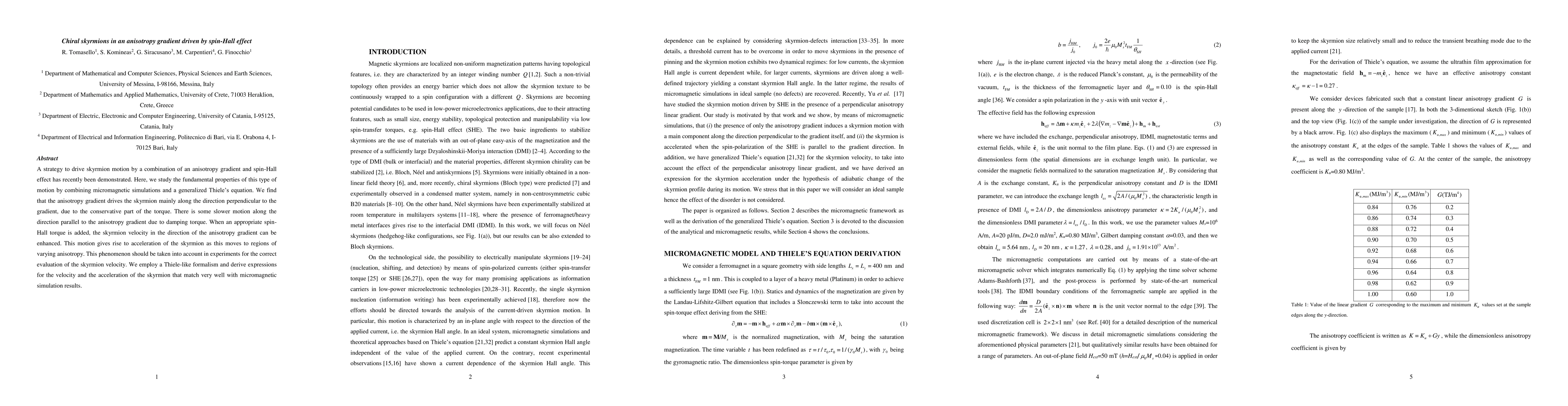 This research combines micromagnetic simulations and a generalized Thiele equation to study chiral skyrmion motion driven by an anisotropy gradient and spin Hall effect. Skyrmions move primarily perpendicular to the gradient due to conservative torque, with slower parallel motion from damping torque. Adding spin Hall torque enhances velocity along the gradient, accelerating skyrmions as they reach varying anisotropy regions. The findings provide expressions for skyrmion velocity and acceleration, aiding correct evaluation in experiments.
