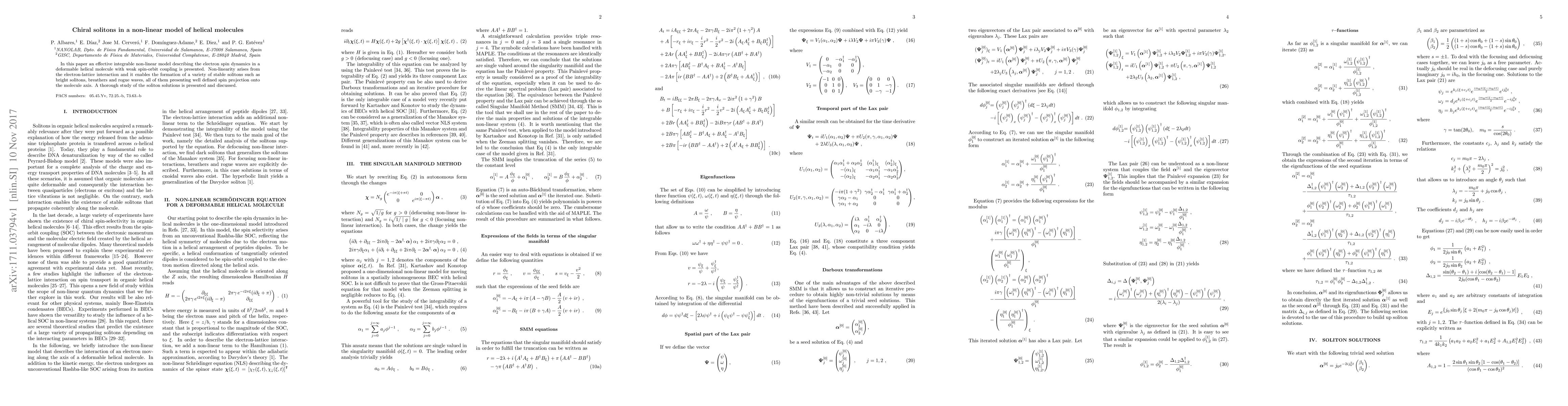 This paper introduces an effective non-linear model for electron spin dynamics in helical molecules, revealing the formation of stable solitons like bright solitons and breathers due to electron-lattice interaction. The study discusses the properties and implications of these soliton solutions.