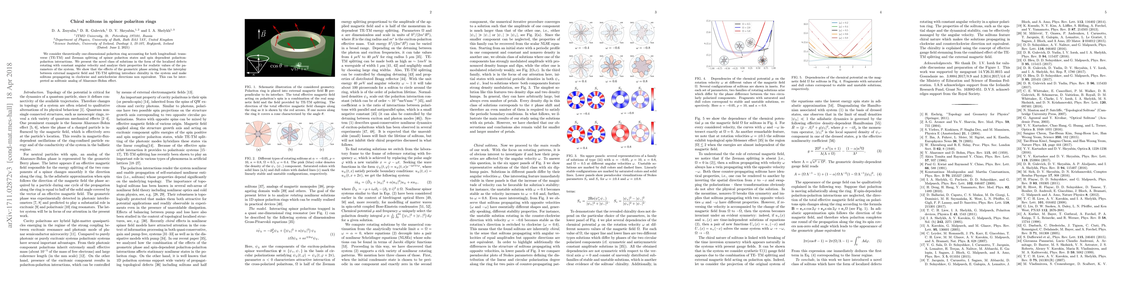 This paper theoretically explores one-dimensional polariton rings with TE-TM and Zeeman splitting, revealing localized rotating defects termed chiral solitons. These solitons exhibit non-equivalent clockwise and anticlockwise propagation due to the geometric phase effect, akin to the Aharonov-Bohm effect.
