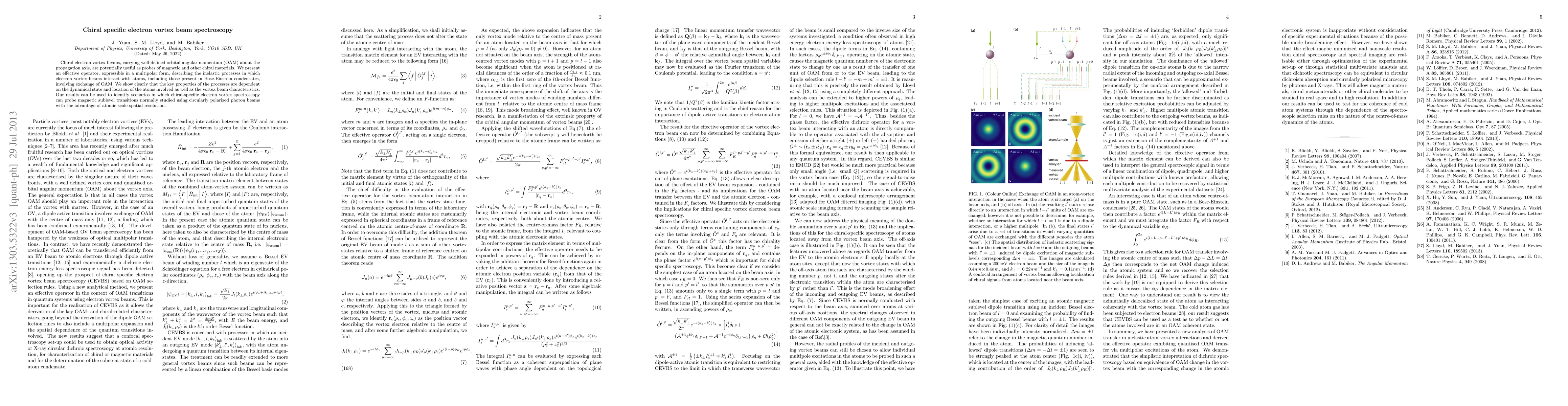 The paper proposes electron vortex beam spectroscopy for probing chiral materials by exploiting orbital angular momentum, revealing selection rules dependent on atomic dynamics and location, potentially inducing magnetic sublevel transitions analogous to those using circularly polarized photon beams.