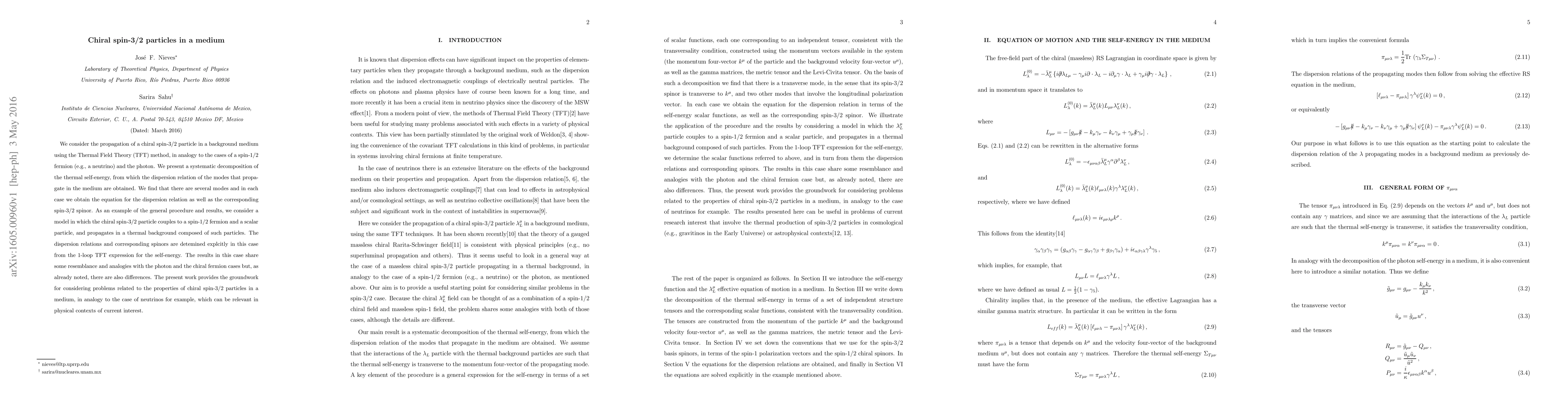 The paper presents a detailed decomposition of the thermal self-energy and derives dispersion relations and corresponding spin-3/2 spinors for a chiral spin-3/2 particle in a medium, using TFT.