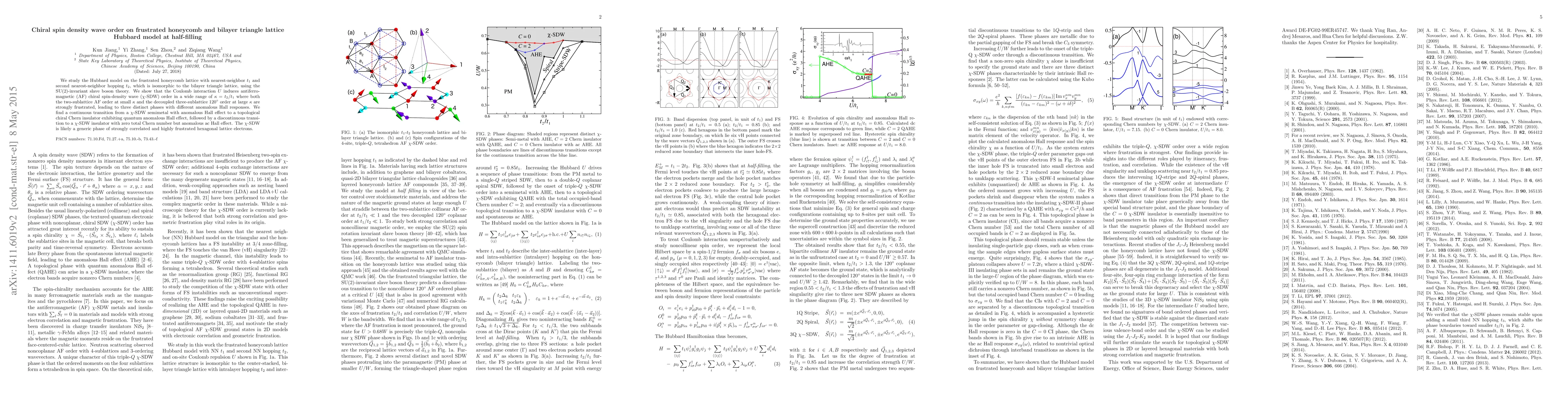 The paper investigates the Hubbard model on frustrated honeycomb lattices, finding that Coulomb interaction induces chiral spin-density wave (χ-SDW) order in various κ (t2/t1) ranges. This leads to three distinct phases with unique anomalous Hall responses, showcasing a continuous transition from a χ-SDW semimetal to a topological chiral Chern insulator, and a discontinuous transition to a χ-SDW insulator. The χ-SDW is suggested to be a prevalent phase for strongly correlated, frustrated hexagonal lattice electrons.