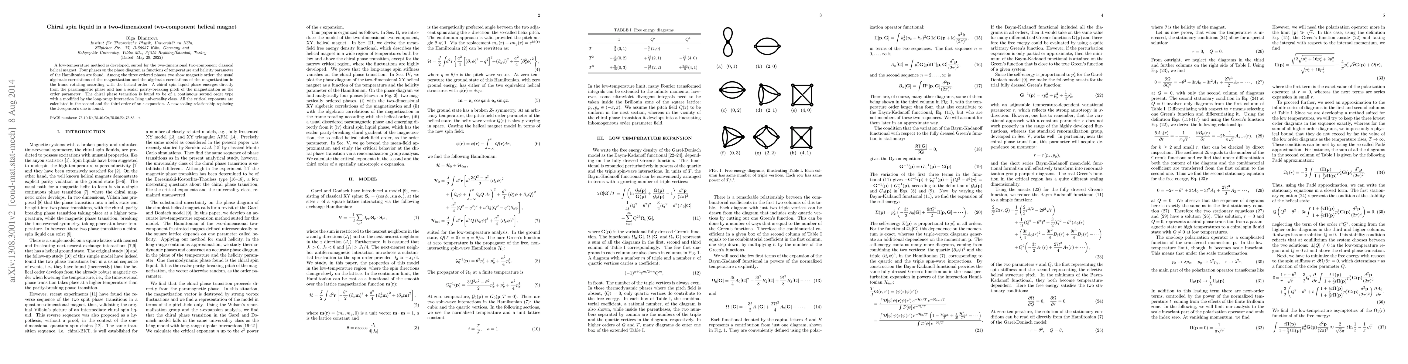 The study develops a low-temperature method for a two-dimensional helical magnet, identifying four phases including a chiral spin liquid with a scalar parity-breaking order parameter, transitioning continuously with modified Ising universality, and new scaling relationships.