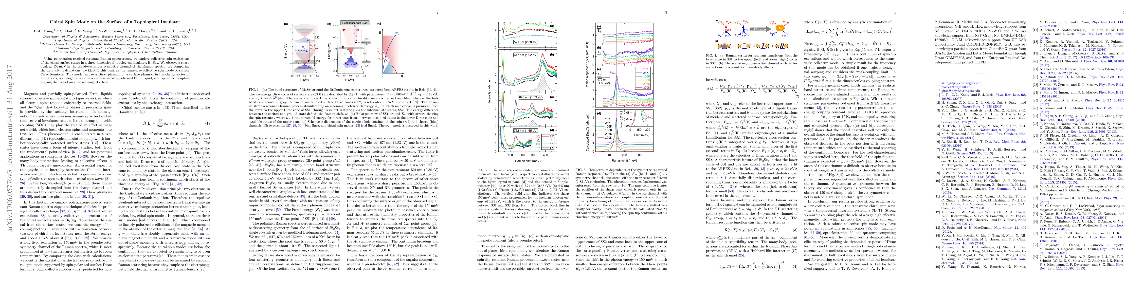 This study identifies a chiral spin mode in the surface states of a topological insulator using Raman spectroscopy, revealing a peak at 150 meV indicative of transverse collective spin excitations in Bi$_2$Se$_3$. The observed mode is analogous to a spin wave in a partially polarized Fermi liquid, highlighting the role of spin-orbit coupling as an effective magnetic field.