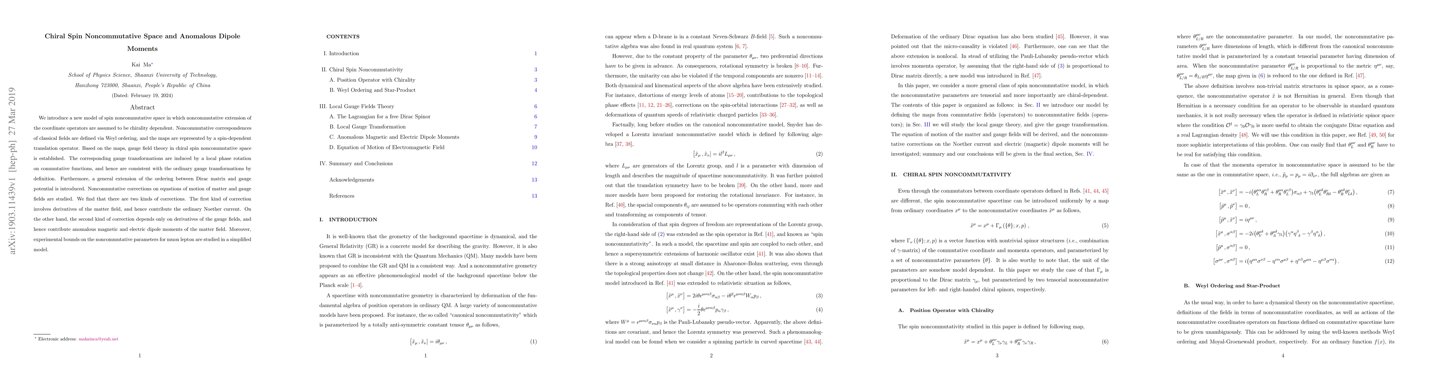 This paper develops a chiral spin noncommutative space model where noncommutative coordinates depend on chirality, leading to gauge field theory in this space. It identifies two types of noncommutative corrections: one contributing to the ordinary Noether current and the other inducing anomalous magnetic and electric dipole moments, with experimental bounds on parameters discussed for muon lepton.