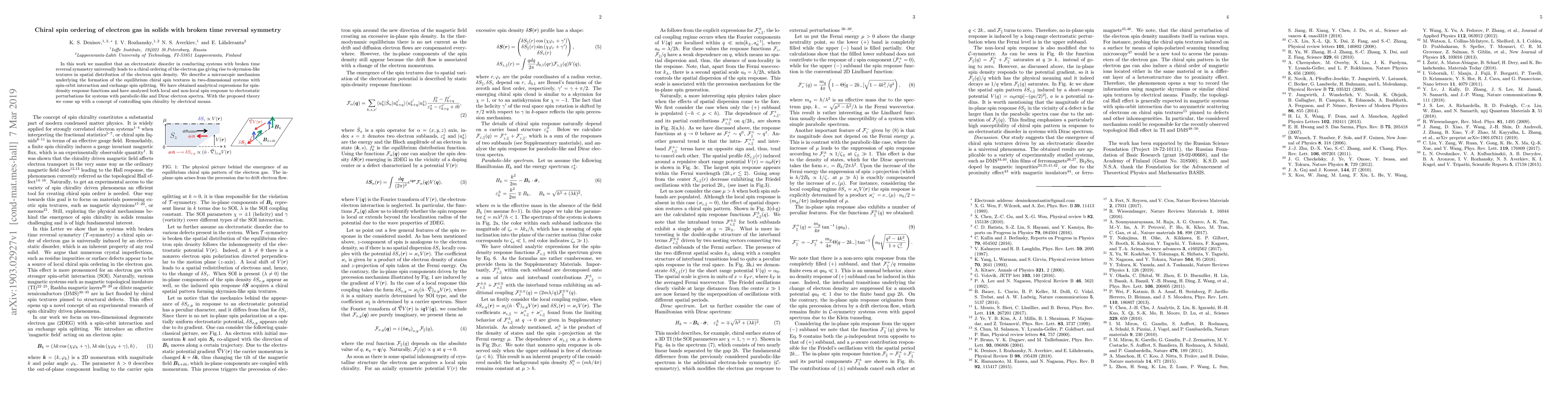 This research demonstrates that electrostatic disorder in systems with broken time reversal symmetry leads to chiral spin ordering and skyrmion-like spin textures in the electron gas. The study provides a microscopic mechanism for these textures in two-dimensional systems and proposes a method to control spin chirality electrically.