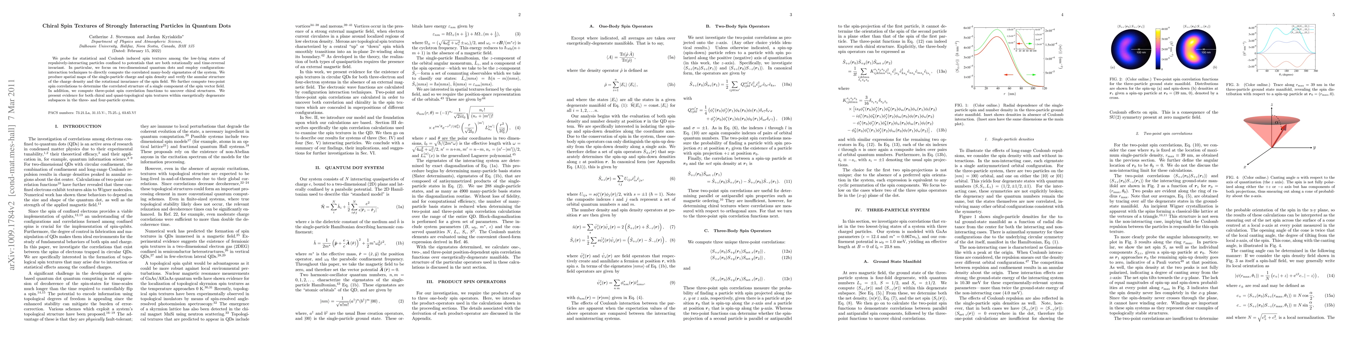 We probe for statistical and Coulomb induced spin textures among the low-lying states of repulsively-interacting particles confined to potentials that are both rotationally and time-reversal invariant. In particular, we focus on two-dimensional quantum dots and employ configuration-interaction techniques to directly compute the correlated many-body eigenstates of the system. We produce spatial maps of the single-particle charge and spin density and verify the annular structure of the charge density and the rotational invariance of the spin field. We further compute two-point spin correlations to determine the correlated structure of a single component of the spin vector field. In addition, we compute three-point spin correlation functions to uncover chiral structures. We present evidence for both chiral and quasi-topological spin textures within energetically degenerate subspaces in the three- and four-particle system.