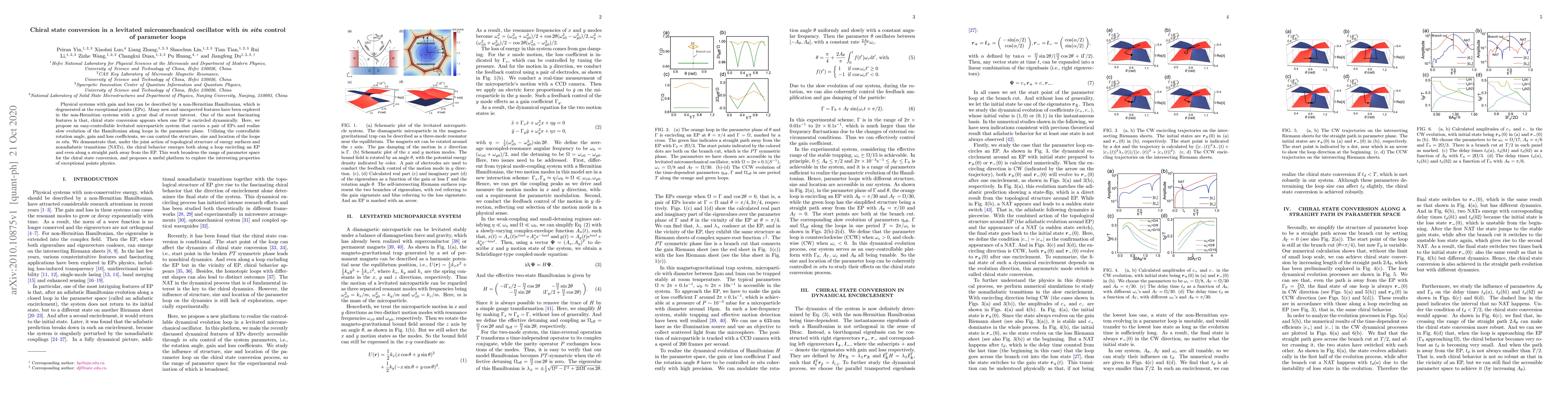 Physical systems with gain and loss can be described by a non-Hermitian Hamiltonian, which is degenerated at the exceptional points (EPs). Many new and unexpected features have been explored in the non-Hermitian systems with a great deal of recent interest. One of the most fascinating features is that, chiral state conversion appears when one EP is encircled dynamically. Here, we propose an easy-controllable levitated microparticle system that carries a pair of EPs and realize slow evolution of the Hamiltonian along loops in the parameter plane. Utilizing the controllable rotation angle, gain and loss coefficients, we can control the structure, size and location of the loops in situ. We demonstrate that, under the joint action of topological structure of energy surfaces and nonadiabatic transitions (NATs), the chiral behavior emerges both along a loop encircling an EP and even along a straight path away from the EP. This work broadens the range of parameter space for the chiral state conversion, and proposes a useful platform to explore the interesting properties of exceptional points physics.