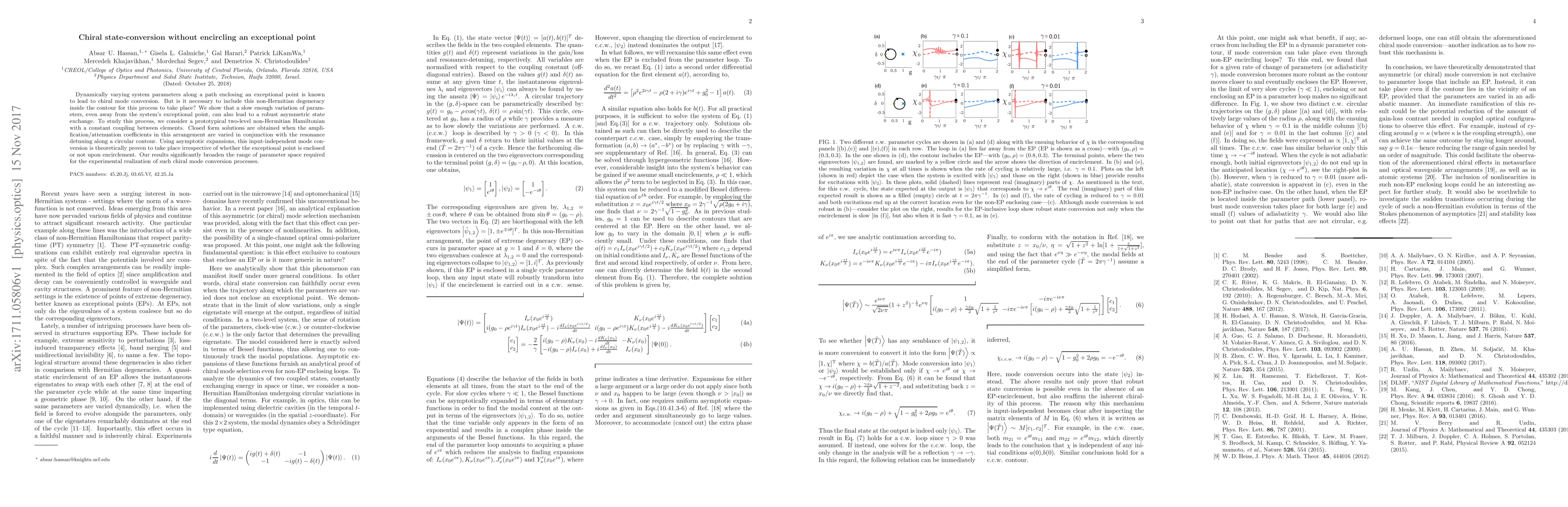 This paper demonstrates that chiral state-conversion can occur without encircling an exceptional point, showing that slow parameter variations away from this point can still achieve robust asymmetric state exchange. The study uses a two-level non-Hermitian Hamiltonian to theoretically prove input-independent mode conversion, broadening the experimental parameter space for such processes.