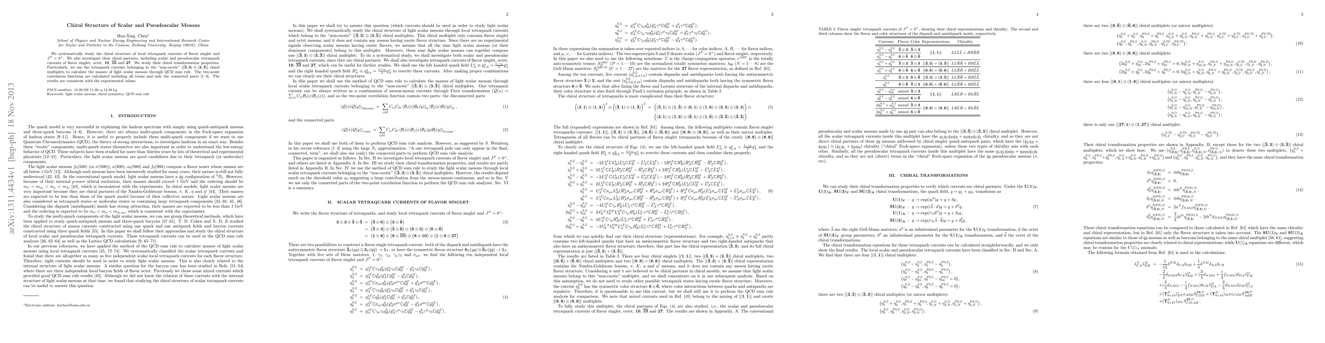 This paper systematically investigates the chiral structure of local tetraquark currents, focusing on flavor singlet and J(P)=0(+) states, and their chiral partners. The study calculates the masses of light scalar mesons using QCD sum rules, finding results consistent with experimental values.