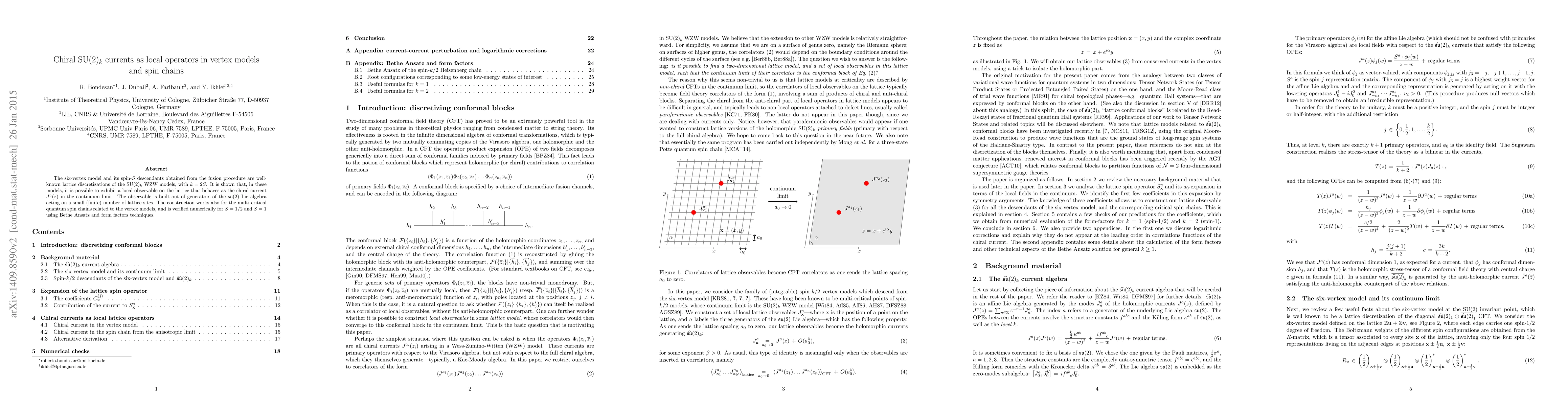 The six-vertex model and its spin-$S$ descendants obtained from the fusion procedure are well-known lattice discretizations of the SU$(2)_k$ WZW models, with $k=2S$. It is shown that, in these models, it is possible to exhibit a local observable on the lattice that behaves as the chiral current $J^a(z)$ in the continuum limit. The observable is built out of generators of the su$(2)$ Lie algebra acting on a small (finite) number of lattice sites. The construction works also for the multi-critical quantum spin chains related to the vertex models, and is verified numerically for $S=1/2$ and $S=1$ using Bethe Ansatz and form factors techniques.