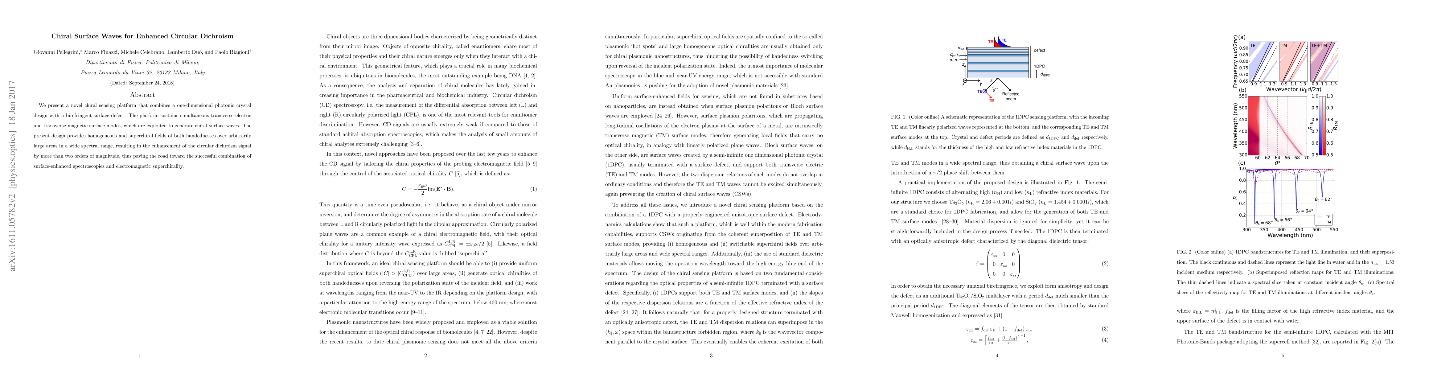 The research introduces a chiral sensing platform utilizing a photonic crystal with a birefringent defect to generate chiral surface waves, significantly enhancing circular dichroism signals by two orders of magnitude over large areas and wide spectra, combining surface-enhanced spectroscopies with electromagnetic superchirality.