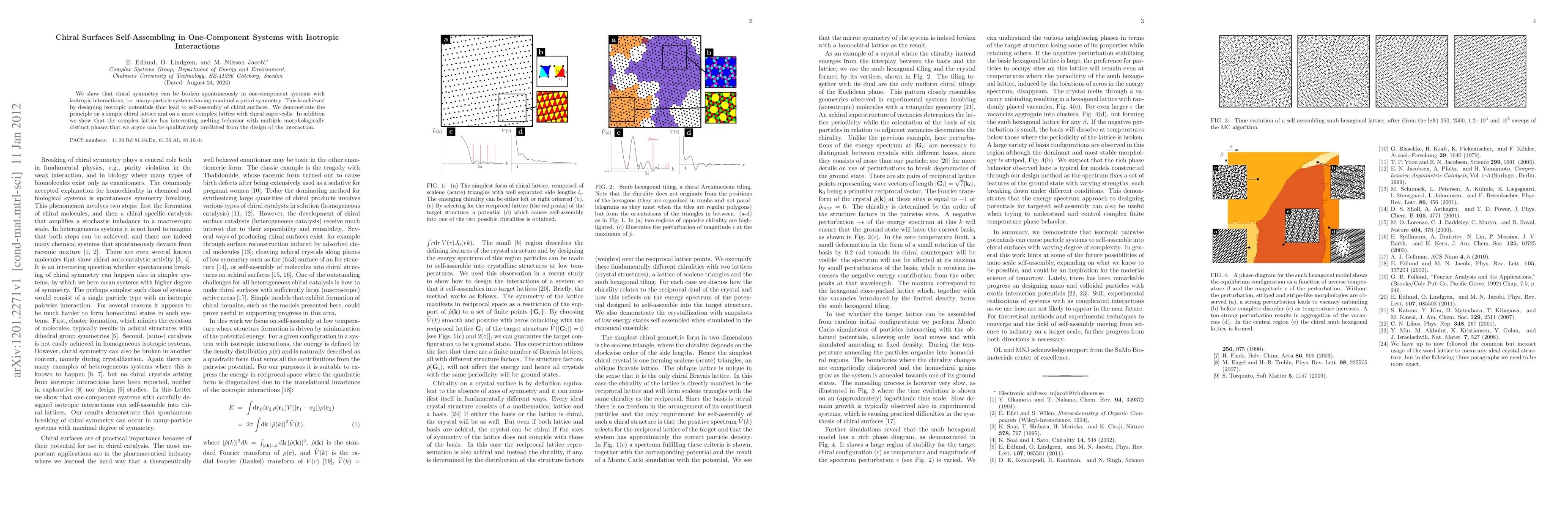 This paper demonstrates that chiral symmetry can spontaneously break in one-component systems with isotropic interactions, achieved through self-assembling chiral surfaces. The principle is illustrated on simple and complex chiral lattices, which exhibit distinct melting behaviors and multiple morphological phases.