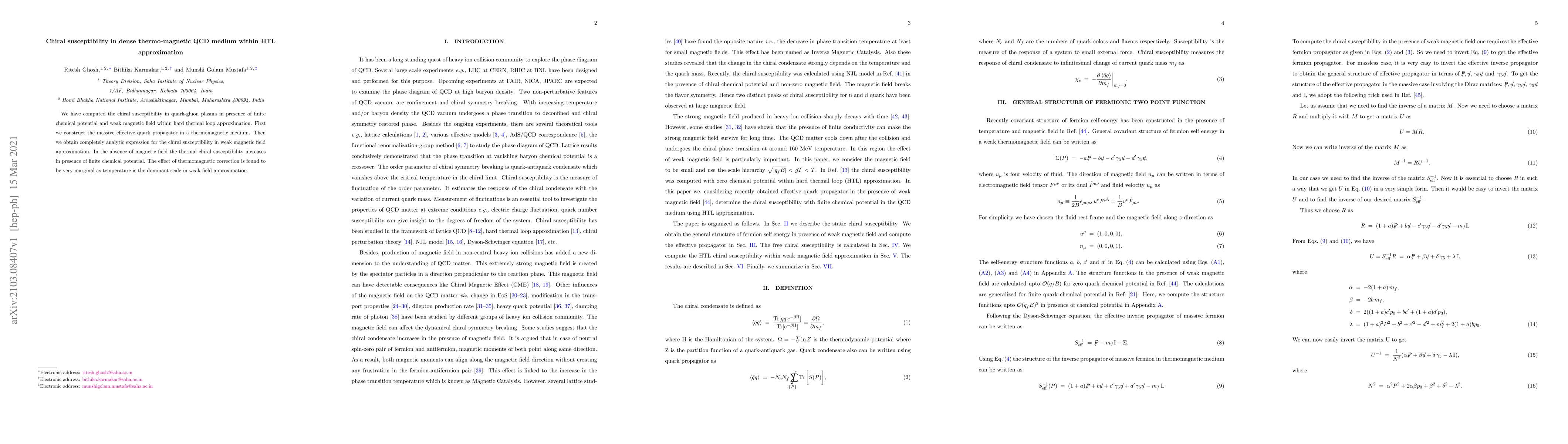 Summary: This study computes chiral susceptibility in dense quark-gluon plasma under finite chemical potential and weak magnetic field using the hard thermal loop approximation, finding a marginal effect of thermomagnetic correction with temperature as the dominant scale.