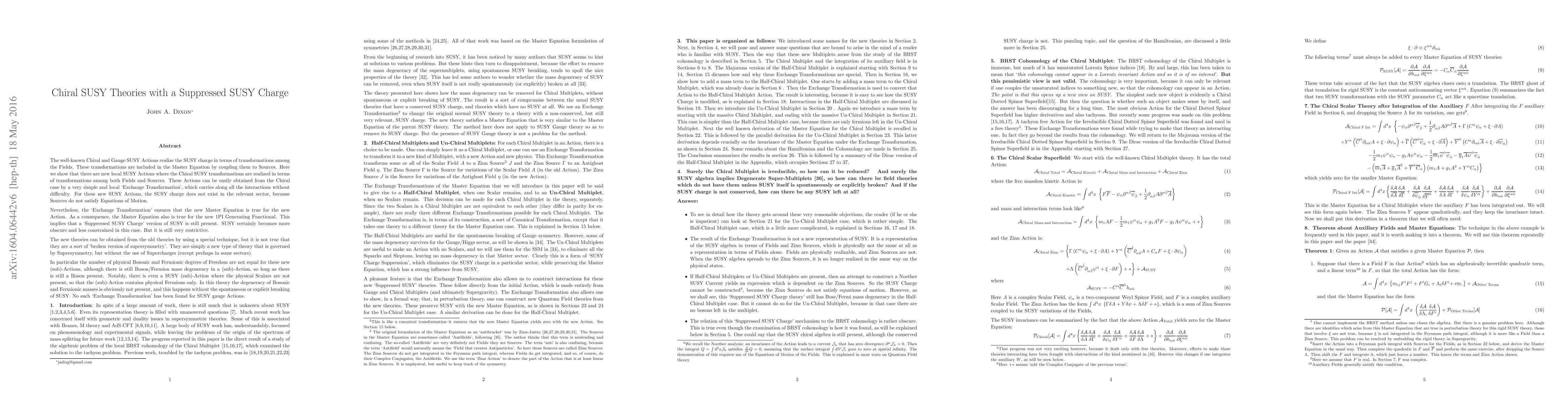The well-known Chiral and Gauge SUSY Actions realize the SUSY charge in terms of transformations among the Fields. These transformations are included in the Master Equation by coupling them to Sources. Here we show that there are new local SUSY Actions where the Chiral SUSY transformations are realized in terms of transformations among both Fields and Sources. These Actions can be easily obtained from the Chiral case by a very simple and local `Exchange Transformation', which carries along all the interactions without difficulty. For these new SUSY Actions, the SUSY charge does not exist in the relevant sector, because Sources do not satisfy Equations of Motion. Nevertheless, the `Exchange Transformation' ensures that the new Master Equation is true for the new Action. As a consequence, the Master Equation also is true for the new 1PI Generating Functional. This implies that a `Suppressed SUSY Charge' version of SUSY is still present. SUSY certainly becomes more obscure and less constrained in this case. But it is still very restrictive. The new theories can be obtained from the old theories by using a special technique, but it is not true that they are a sort of `broken version of supersymmetry'. They are simply a new type of theory that is governed by Supersymmetry, but without the use of Supercharges (except perhaps in some sectors). In particular the number of physical Bosonic and Fermionic degrees of Freedom are not equal for these new (sub)-Actions, although there is still Boson/Fermion mass degeneracy in a (sub)-Action, so long as there is still a Boson present. Notably, there is even a SUSY (sub)-Action where the physical Scalars are not present, so that the (sub)-Action contains physical Fermions only. In this theory the degeneracy of Bosonic and Fermionic masses is obviously not present.