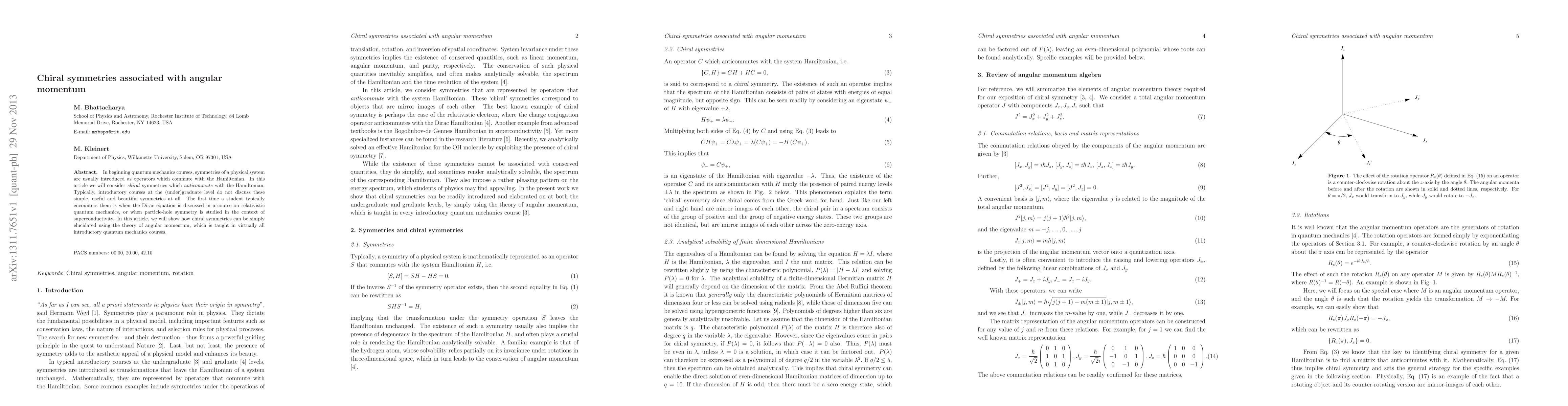In beginning quantum mechanics courses, symmetries of a physical system are usually introduced as operators which commute with the Hamiltonian. In this article we will consider chiral symmetries which anticommute with the Hamiltonian. Typically, introductory courses at the (under)graduate level do not discuss these simple, useful and beautiful symmetries at all. The first time a student typically encounters them is when the Dirac equation is discussed in a course on relativistic quantum mechanics, or when particle-hole symmetry is studied in the context of superconductivity. In this article, we will show how chiral symmetries can be simply elucidated using the theory of angular momentum, which is taught in virtually all introductory quantum mechanics courses.