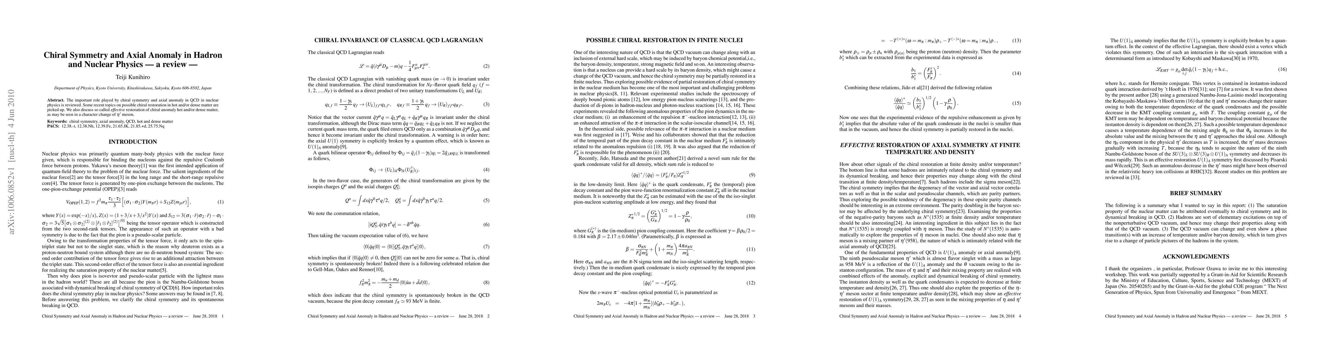 This paper reviews the significance of chiral symmetry and axial anomaly in Quantum Chromodynamics (QCD) within nuclear physics, highlighting recent discussions on chiral restoration in hot and dense matter, and the effective restoration of chiral anomaly observed in the behavior of the $\eta '$ meson.