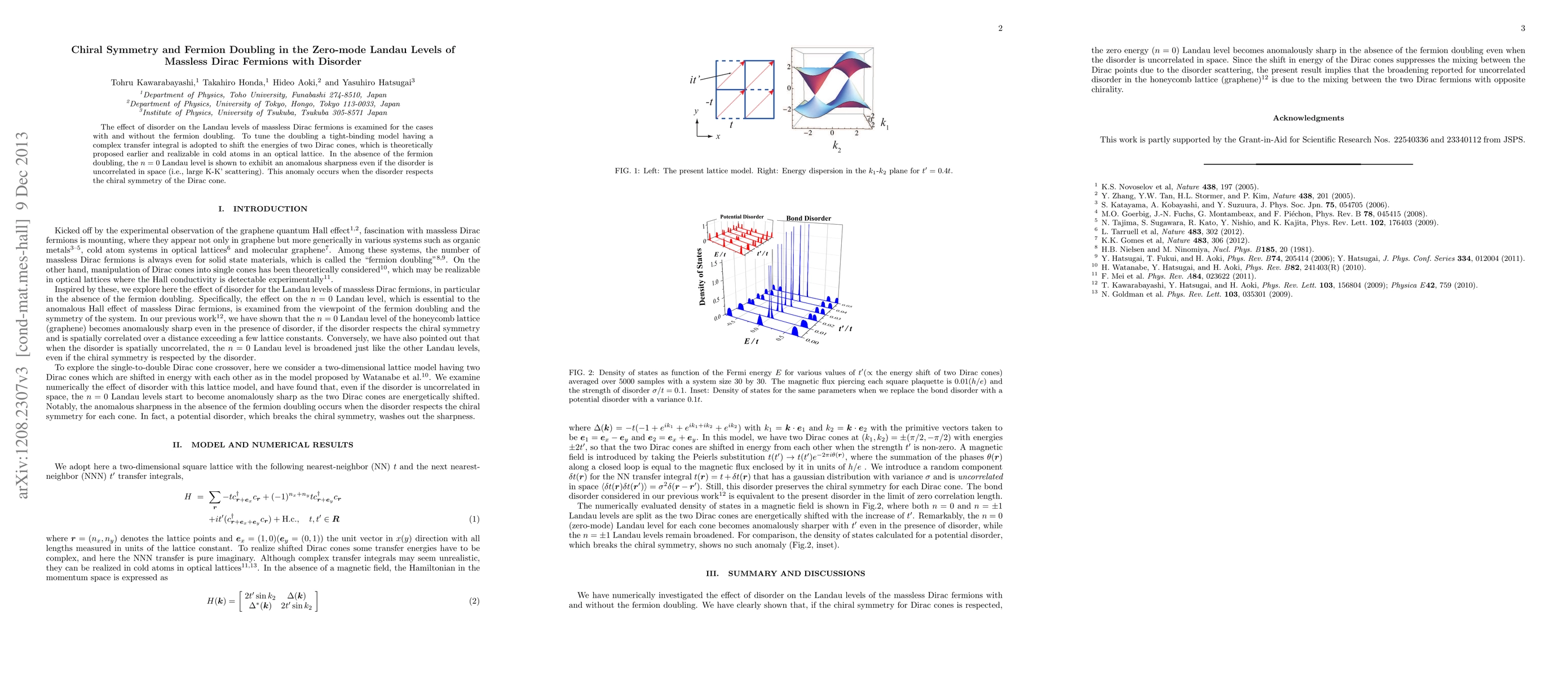 Summary: The paper investigates how disorder affects massless Dirac fermions' Landau levels, demonstrating that chiral symmetry preservation leads to anomalous sharpness in the $n=0$ level even with large K-K' scattering, and explores fermion doubling via a tight-binding model.