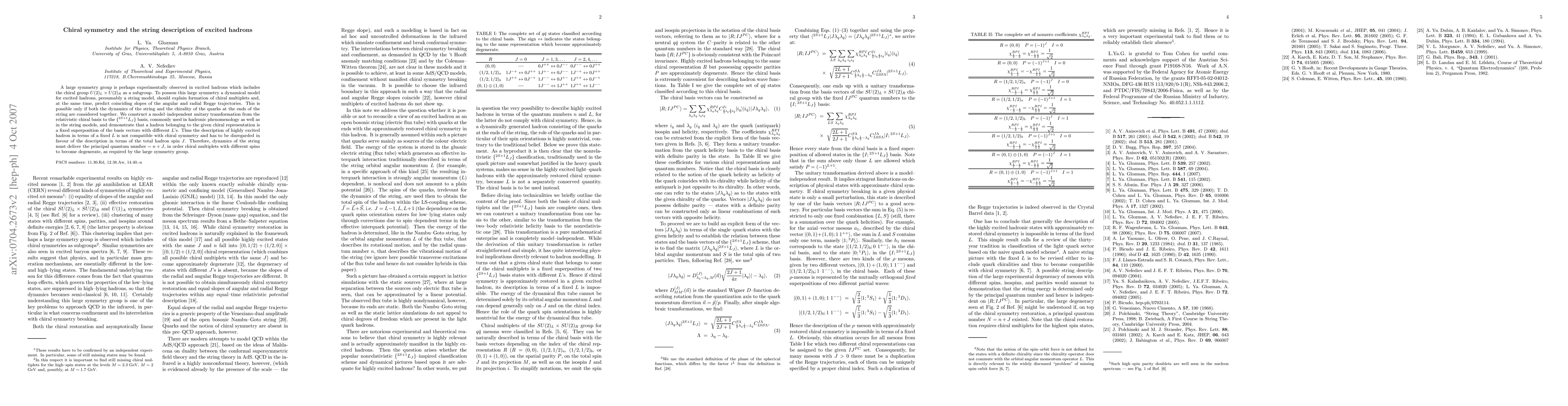 A large symmetry group is perhaps experimentally observed in excited hadrons which includes the chiral group U(2)_L x U(2)_R as a subgroup. To possess this large symmetry a dynamical model for excited hadrons, presumably a string model, should explain formation of chiral multiplets and, at the same time, predict coinciding slopes of the angular and radial Regge trajectories. This is possible only if both the dynamics of the string and the chirality of the quarks at the ends of the string are considered together. We construct a model-independent unitary transformation from the relativistic chiral basis to the ^{2S+1}L_J basis, commonly used in hadronic phenomenology as well as in the string models, and demonstrate that a hadron belonging to the given chiral representation is a fixed superposition of the basis vectors with different L's and S's. Thus the description of highly excited hadron in terms of a fixed L is not compatible with chiral symmetry and has to be disregarded in favour of the description in terms of the total hadron spin J. Therefore, dynamics of the string must deliver the principal quantum number ~n+J, in order chiral multiplets with different spins to become degenerate, as required by the large symmetry group.