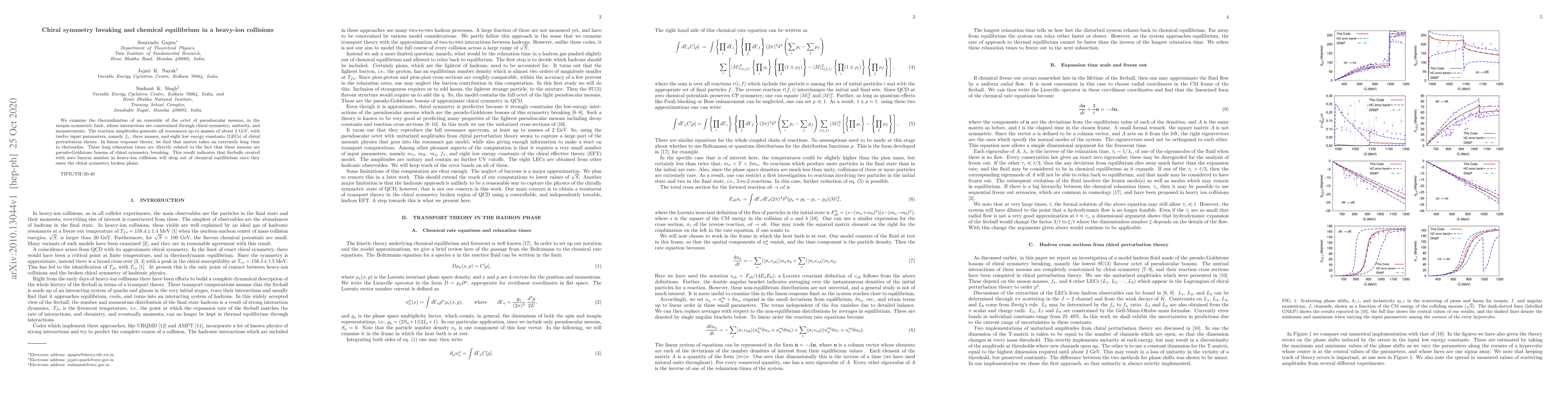 We examine the thermalization of an ensemble of the octet of pseudoscalar mesons, in the isospin symmetric limit, whose interactions are constrained through chiral symmetry, unitarity, and measurements. The reaction amplitudes generate all resonances up to masses of about 2 GeV, with twelve input parameters, namely f_pi, three masses, and eight low energy constants (LECs) of chiral perturbation theory. In linear response theory, we find that matter takes an extremely long time to thermalize. These long relaxation times are directly related to the fact that these mesons are pseudo-Goldstone bosons of chiral symmetry breaking. This result indicates that fireballs created with zero baryon number in heavy-ion collisions will drop out of chemical equilibrium once they enter the chiral symmetry broken phase.