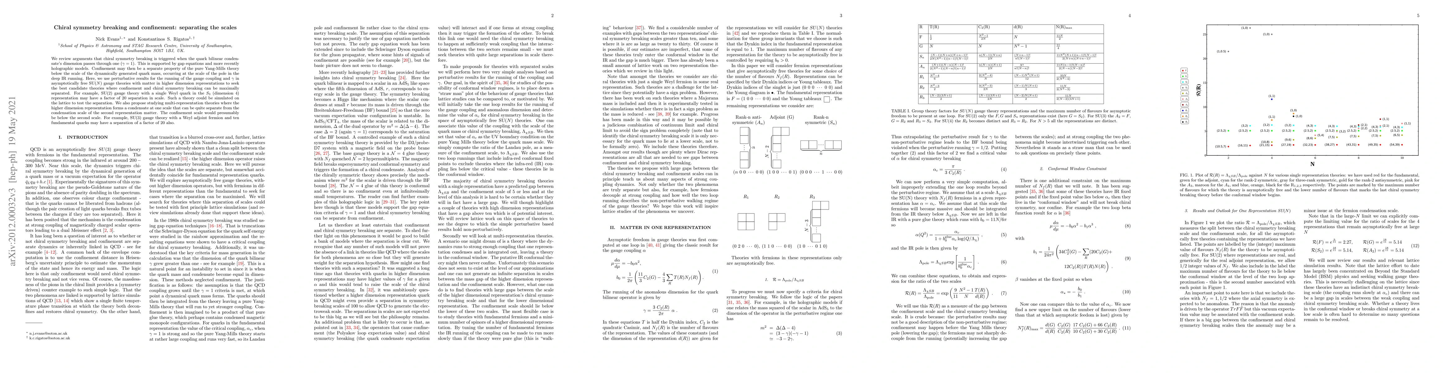 We review arguments that chiral symmetry breaking is triggered when the quark bilinear condensate's dimension passes through one ($\gamma=1$). This is supported by gap equations and more recently holographic models. Confinement may then be a separate property of the pure Yang-Mills theory below the scale of the dynamically generated quark mass, occurring at the scale of the pole in the deep IR running. Here, we use perturbative results for the running of the gauge coupling and $\gamma$ in asymptotically free SU($N_c$) gauge theories with matter in higher dimension representations to seek the best candidate theories where confinement and chiral symmetry breaking can be maximally separated. For example, SU(2) gauge theory with a single Weyl quark in the $S_3$ (dimension 4) representation may have a factor of 20 separation in scale. Such a theory could be simulated on the lattice to test the separation. We also propose studying multi-representation theories where the higher dimension representation forms a condensate at one scale that can be quite separate from the condensation scale of the second representation matter. The confinement scale would presumably be below the second scale. For example, SU(3) gauge theory with a Weyl adjoint fermion and ten fundamental quarks may have a separation of a factor of 20 also.