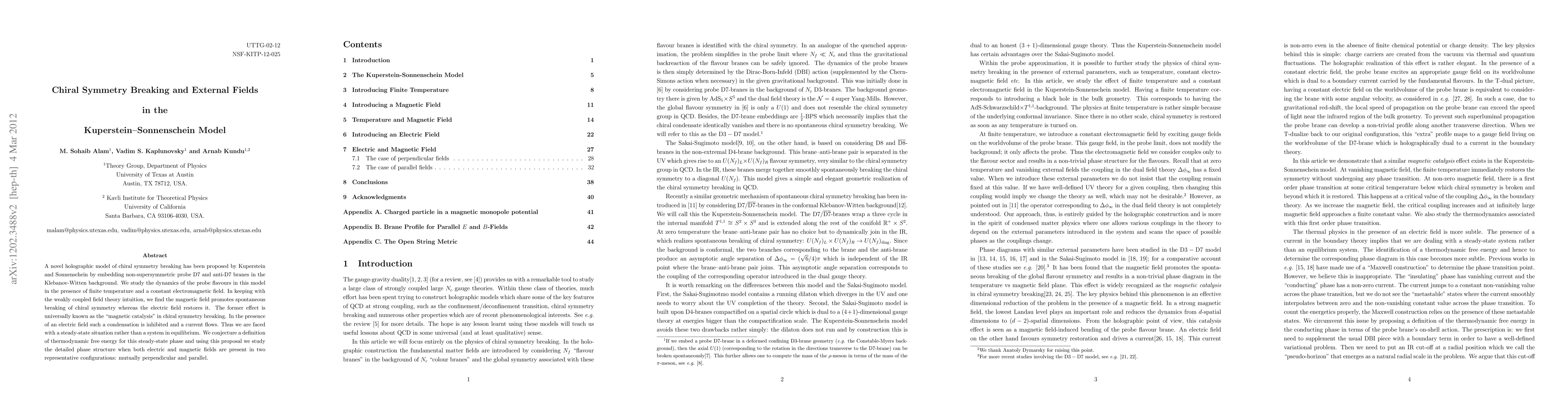 This research explores the chiral symmetry breaking dynamics in the Kuperstein-Sonnenschein holographic model under the influence of temperature and electromagnetic fields. It finds that magnetic fields catalyze symmetry breaking while electric fields restore it, leading to distinct phase structures depending on the field orientations.